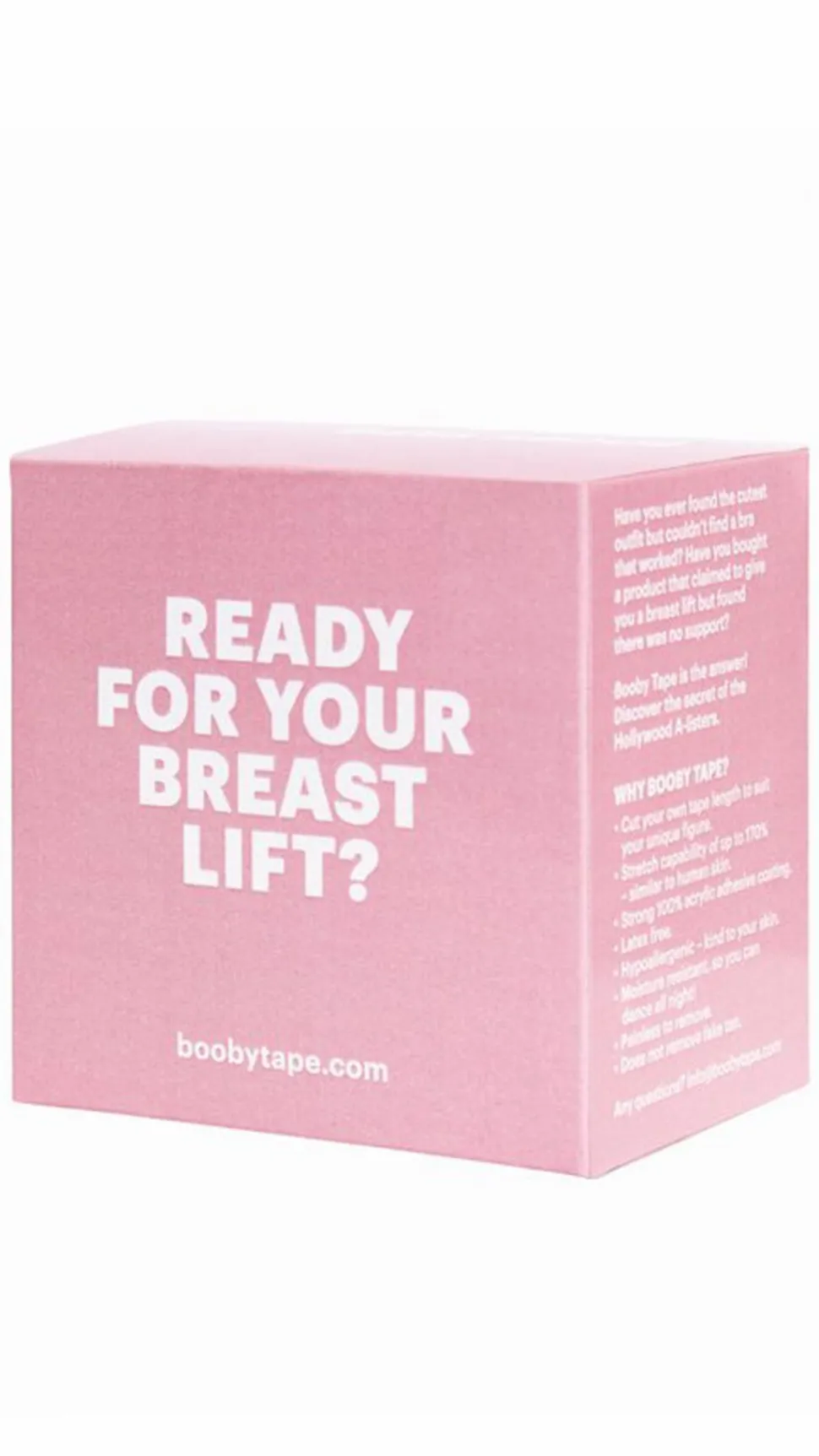 Booby Tape is the original breast lift tape. For many years now celebrities have been taping their breasts with the likes of masking tape and duct tape. These tapes are painful to remove and lack the strength of Booby Tape. Booby tape is the Original breast tape designed to be friendly on skin, and has the strength to hold up the heaviest of breasts.