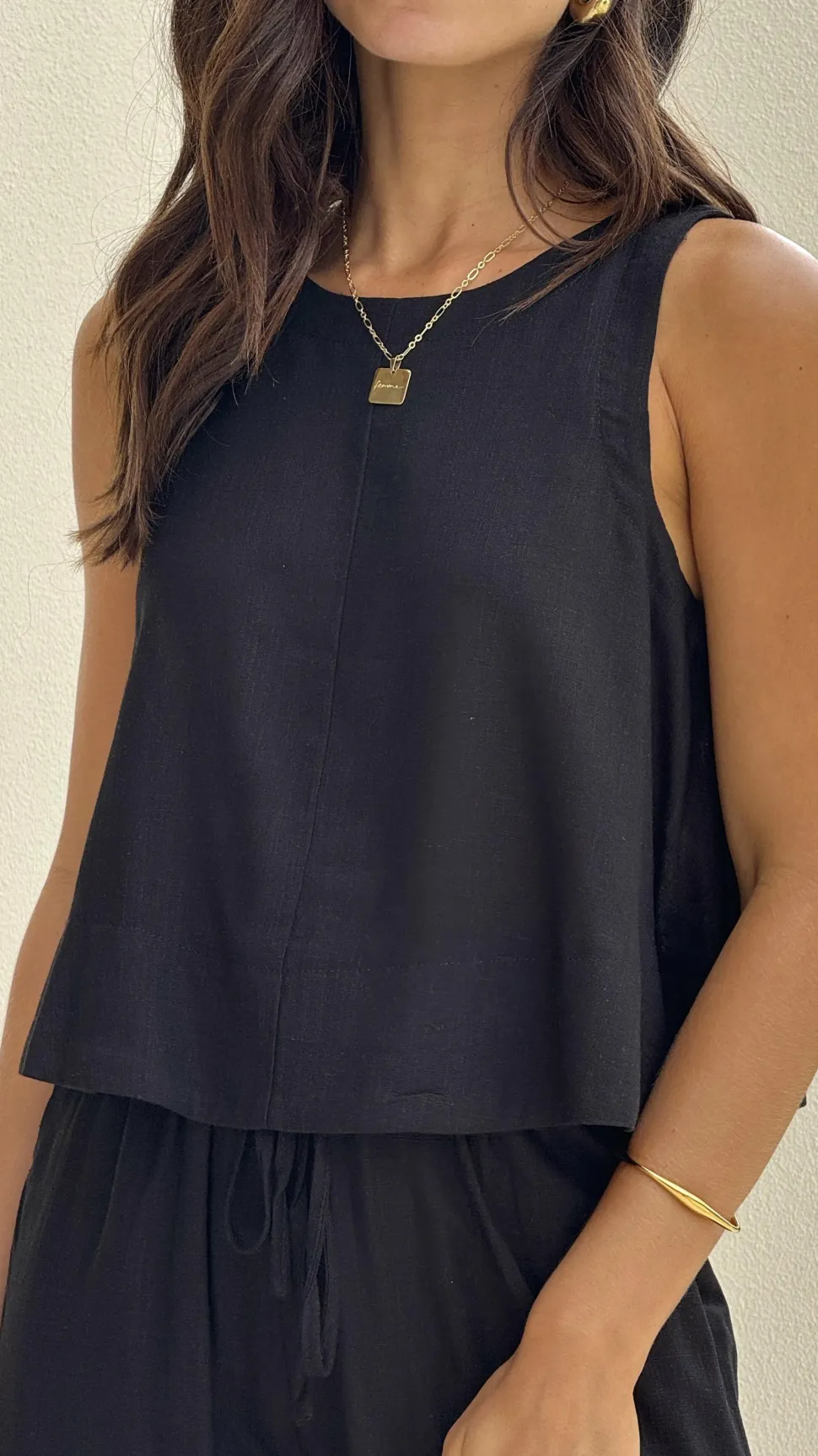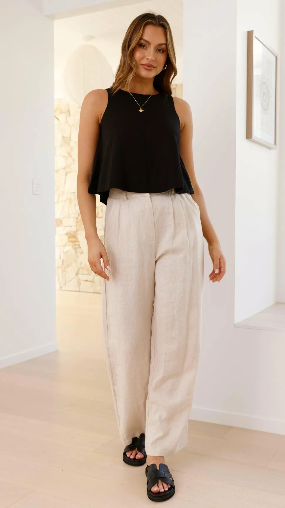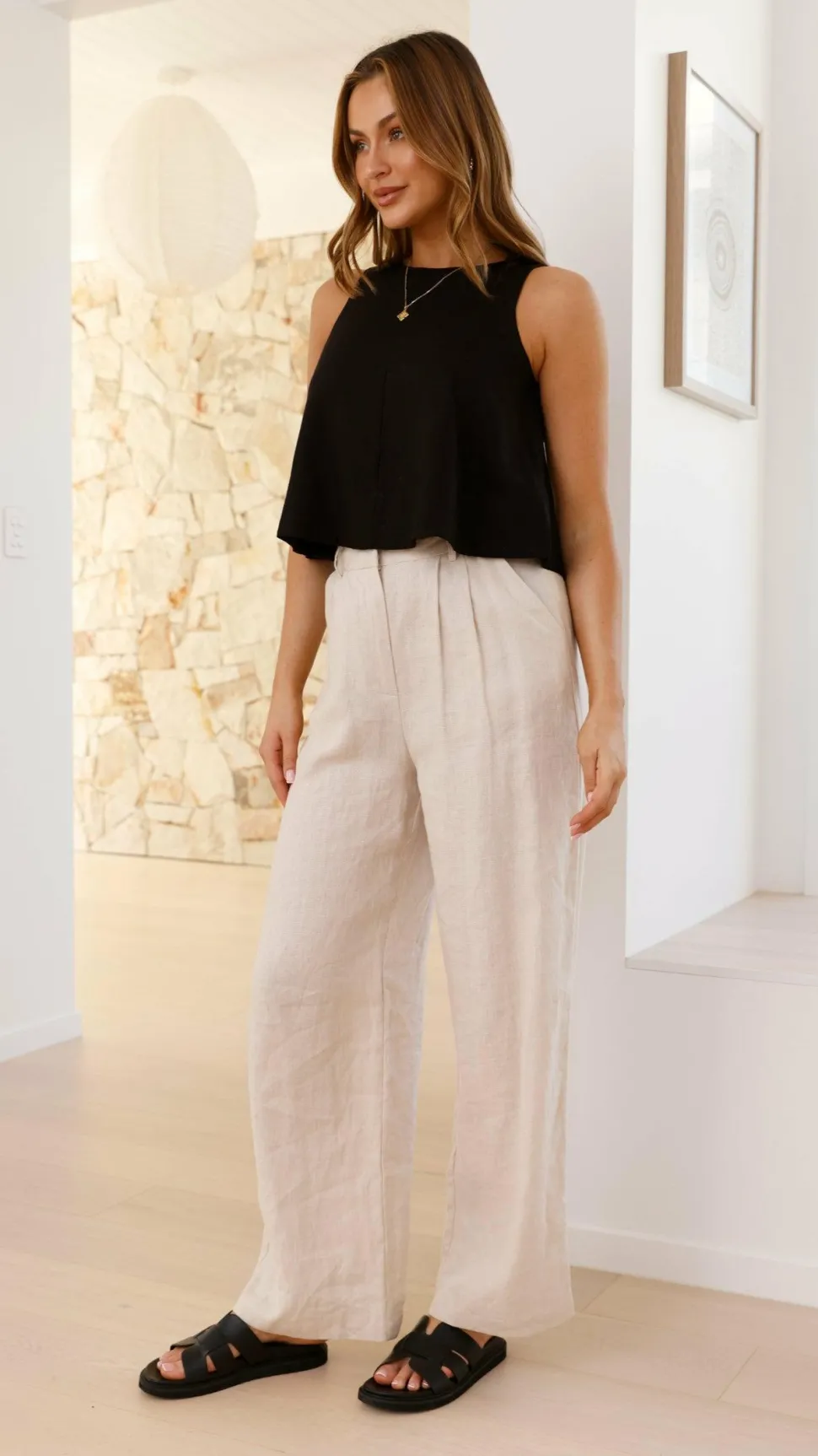 Get the look! Valene Pants – Black, Amylee Slide – Black, Zoelie Sandal – Black & Tillie Pants – Oatmeal