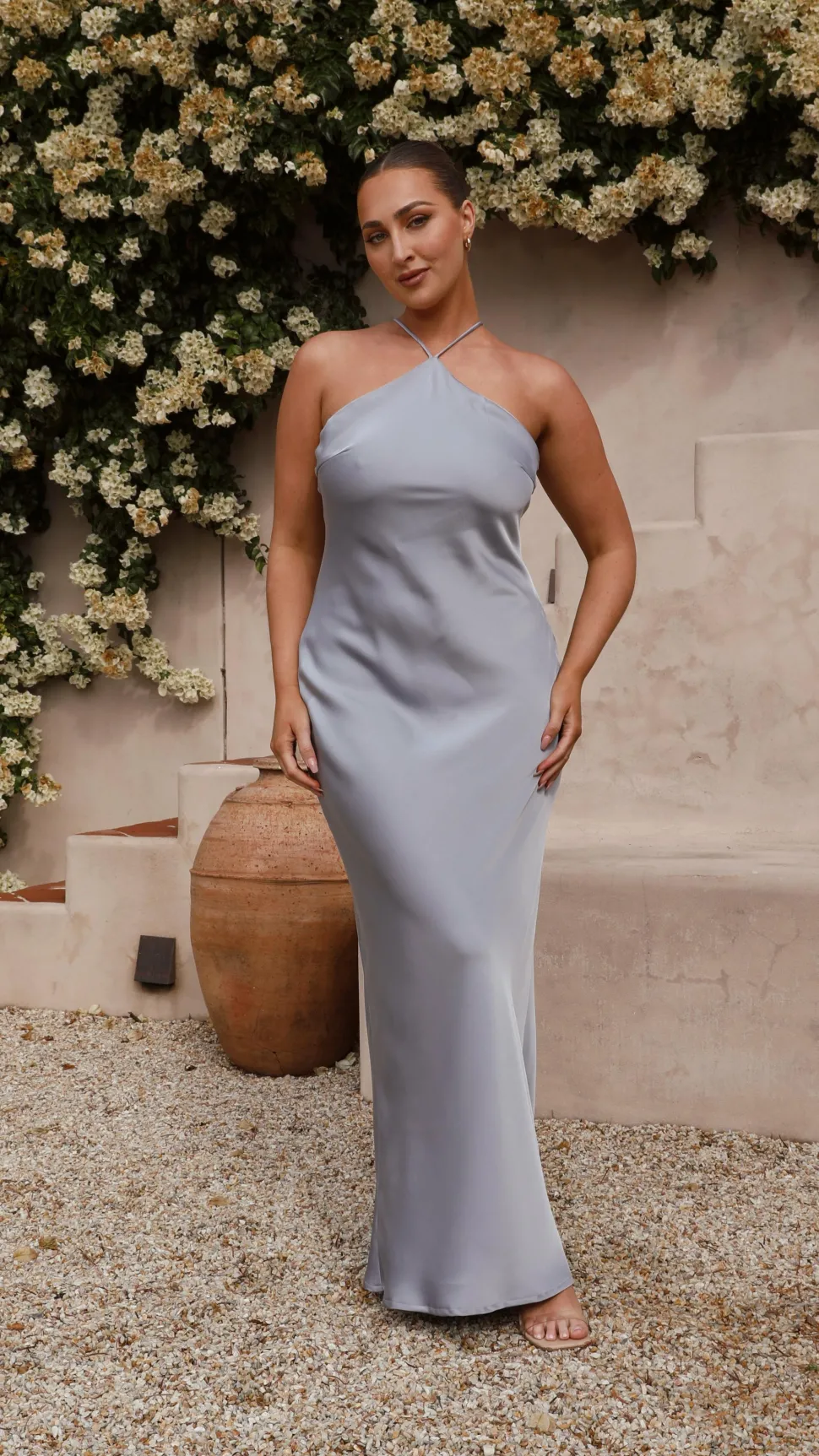 The Chiara Maxi Dress in brown is a timeless piece that exudes elegance and style. The classic full length creates a sophisticated look, while the high halter neckline and tie back detail add a touch of modernity. Perfect for any formal occasion, this dress will make you feel confident and chic.