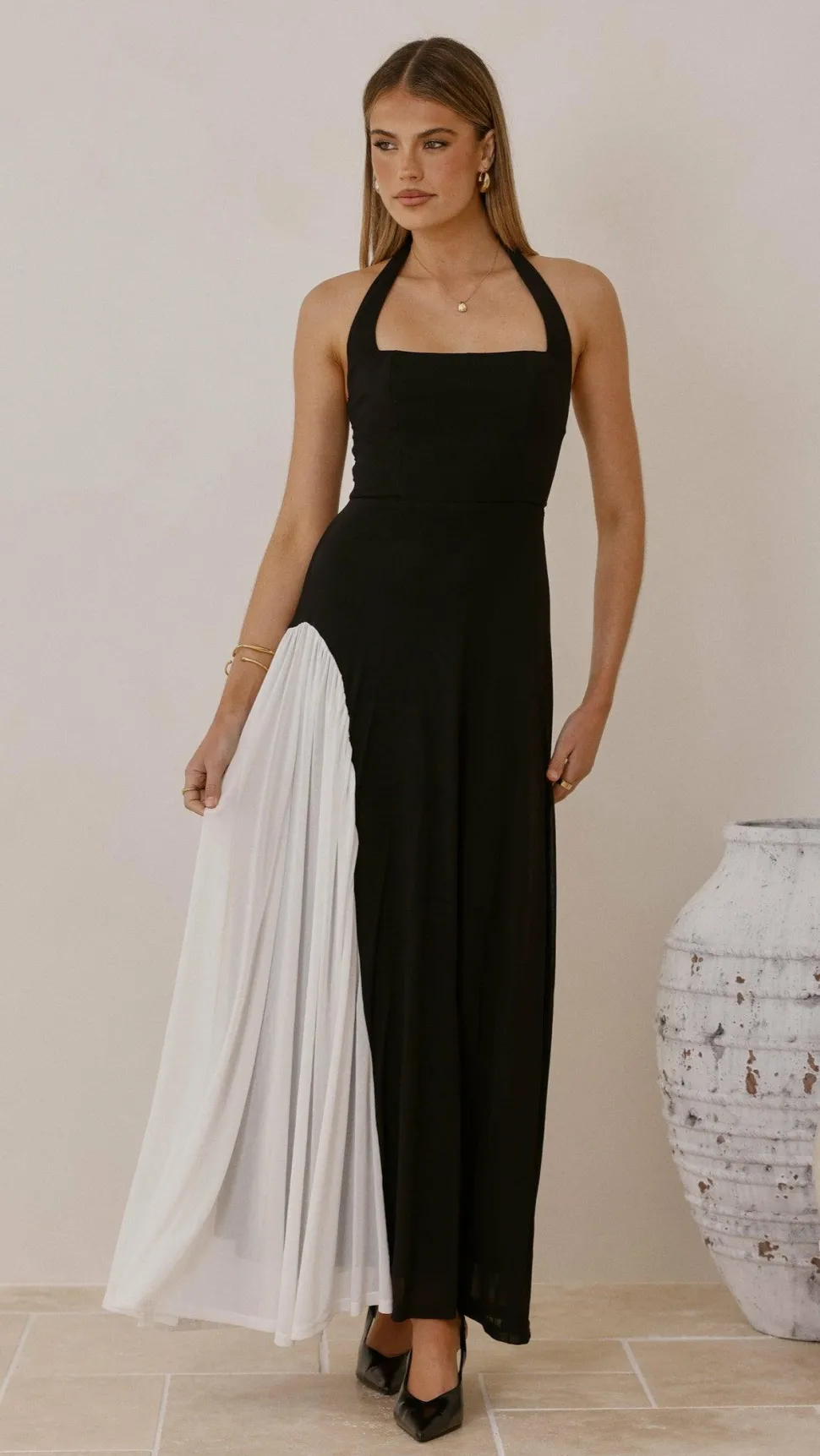 This sophisticated maxi dress features a halter neck design fastened by a button closure. A silicone strip at the back provides a secure fit, complemented by an invisible back zipper. The dress is lined with a delicate mesh overlay, crafted from a blend of 90% polyester and 10% spandex for lasting durability and comfortable stretch.