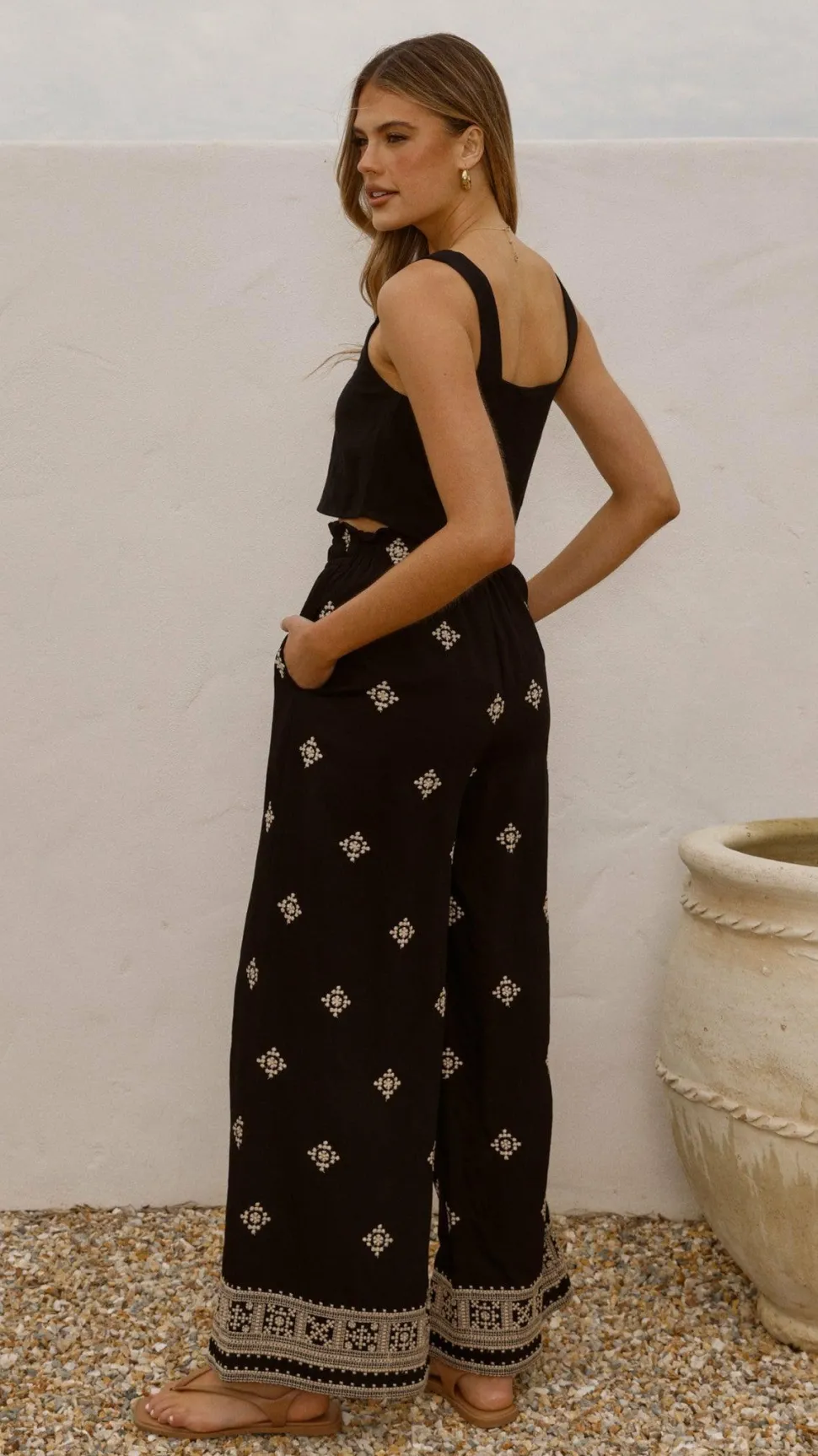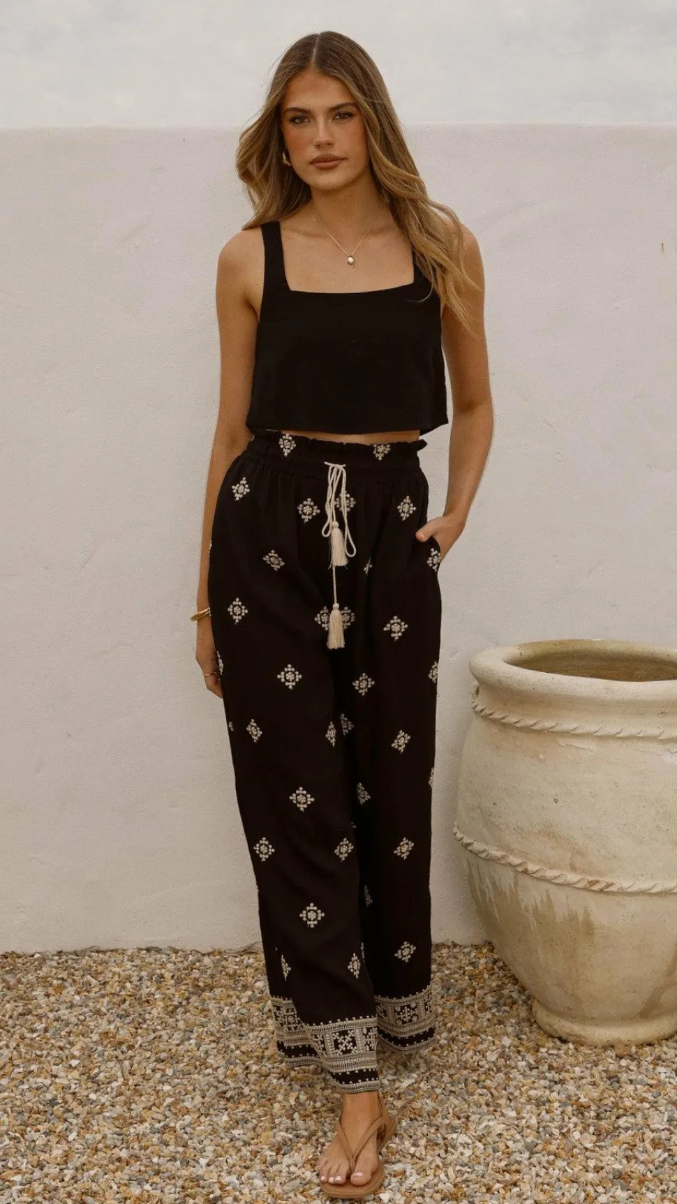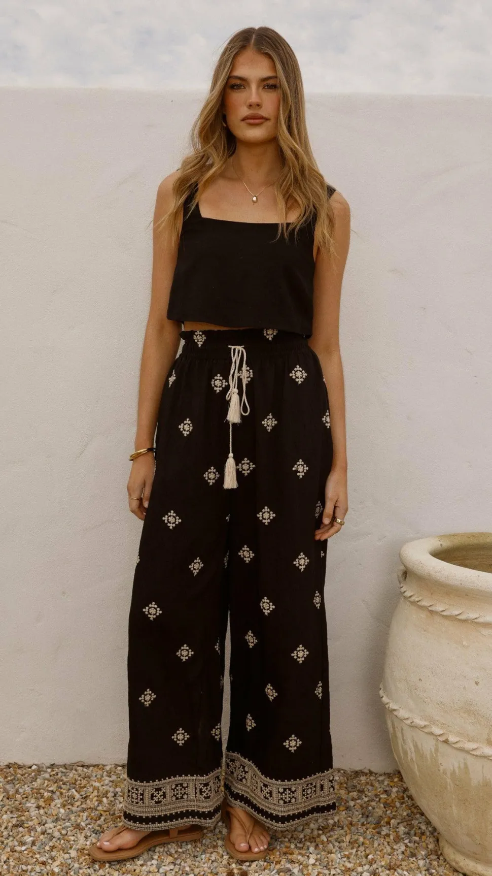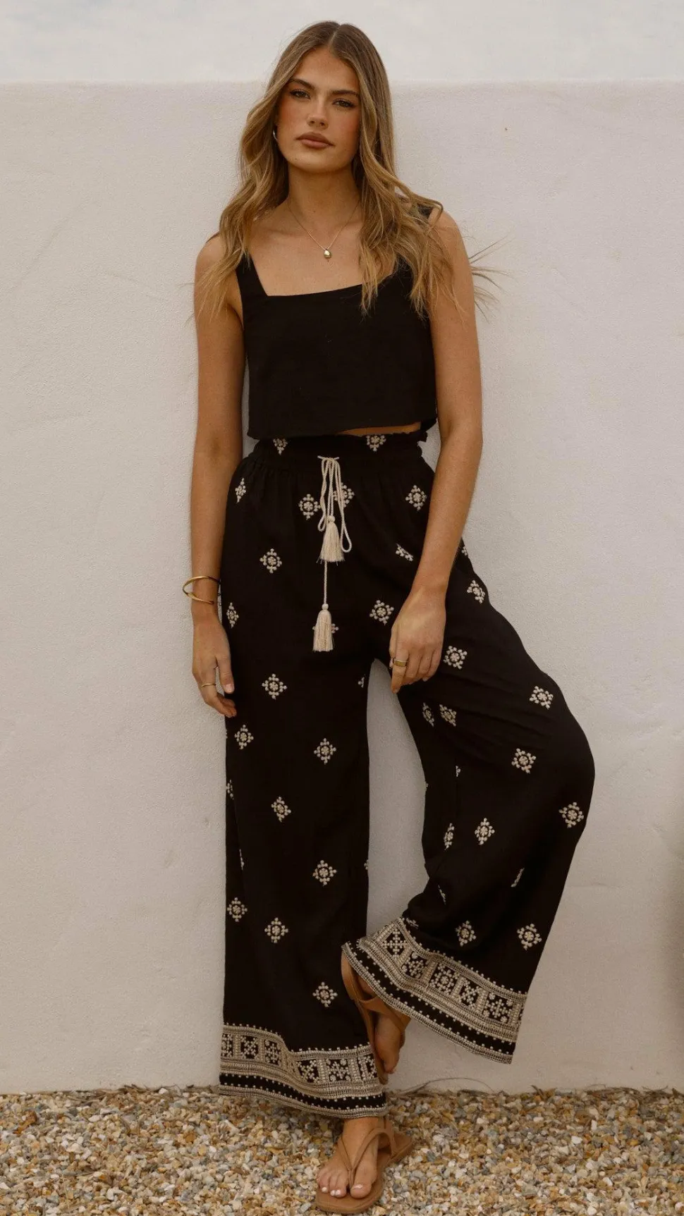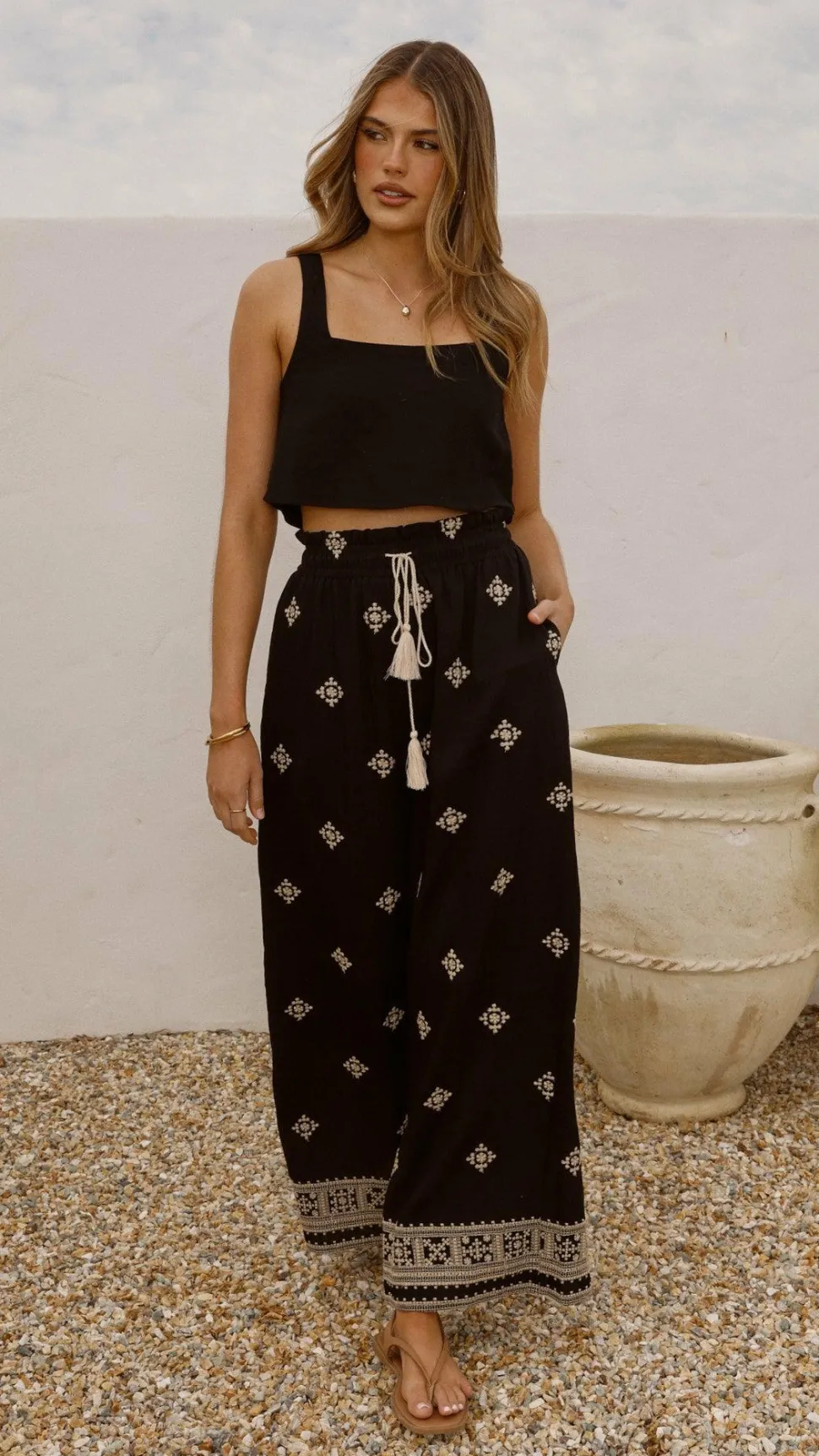 Get the look! Tillie Crop Top – Black & Yaelle Sandals – Teak