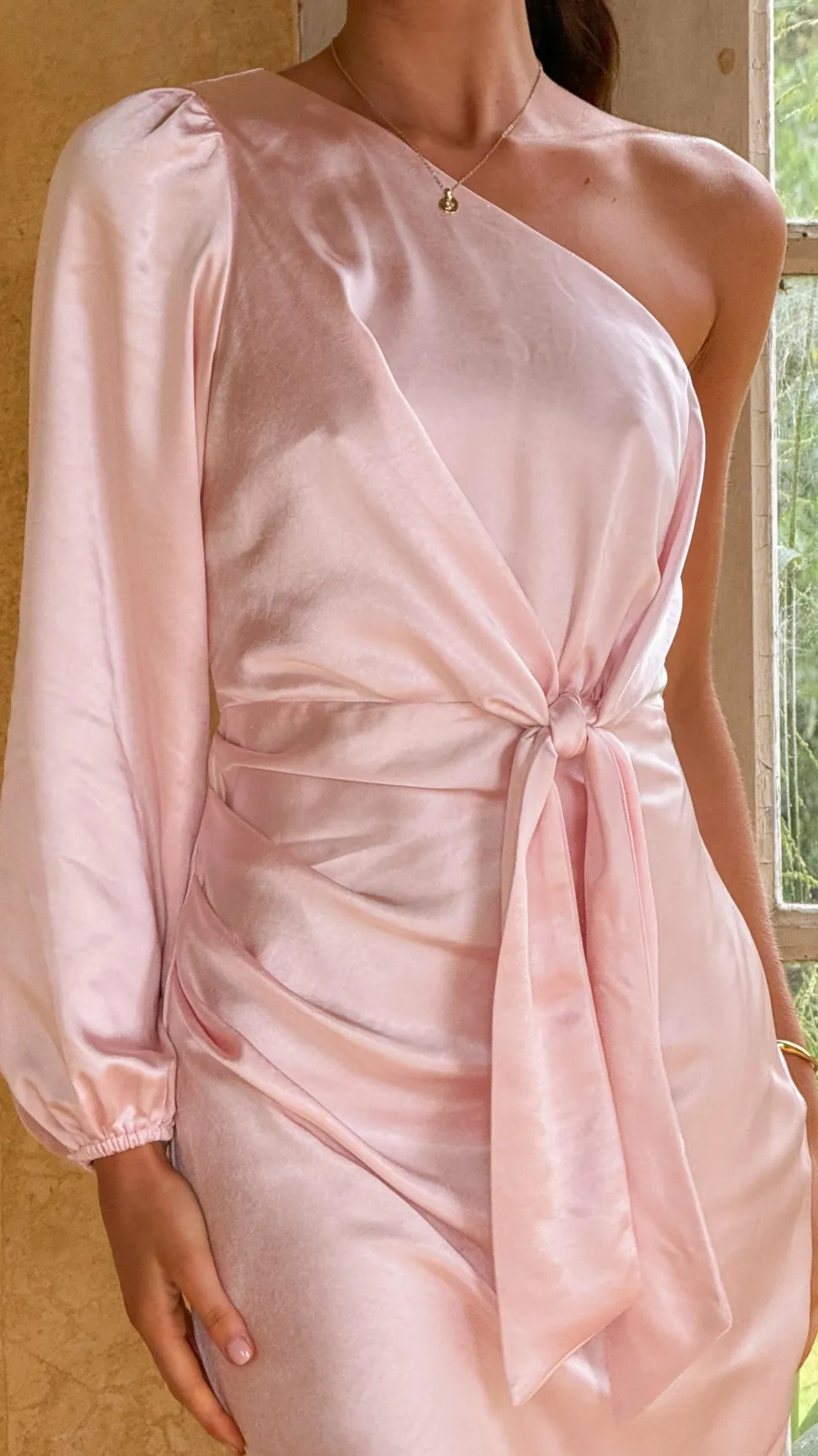 This maxi dress features a one-shoulder silhouette with a silicone grip strip along the neckline for secure wear. It is designed with a front tie, long balloon sleeve, and subtle side gathers. An invisible side zipper and side leg slit add elegance, while the fully lined construction ensures comfort.
