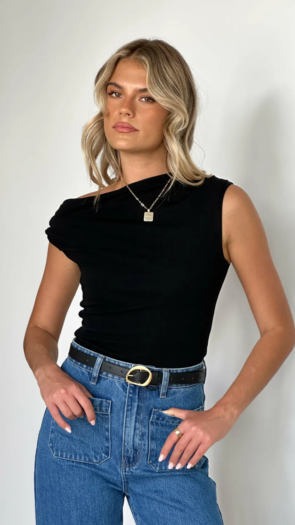 Get the look! Morgana Belt – Black & Rollas Sailor Jean Long – Ashley Blue & Chantel Heel – Black