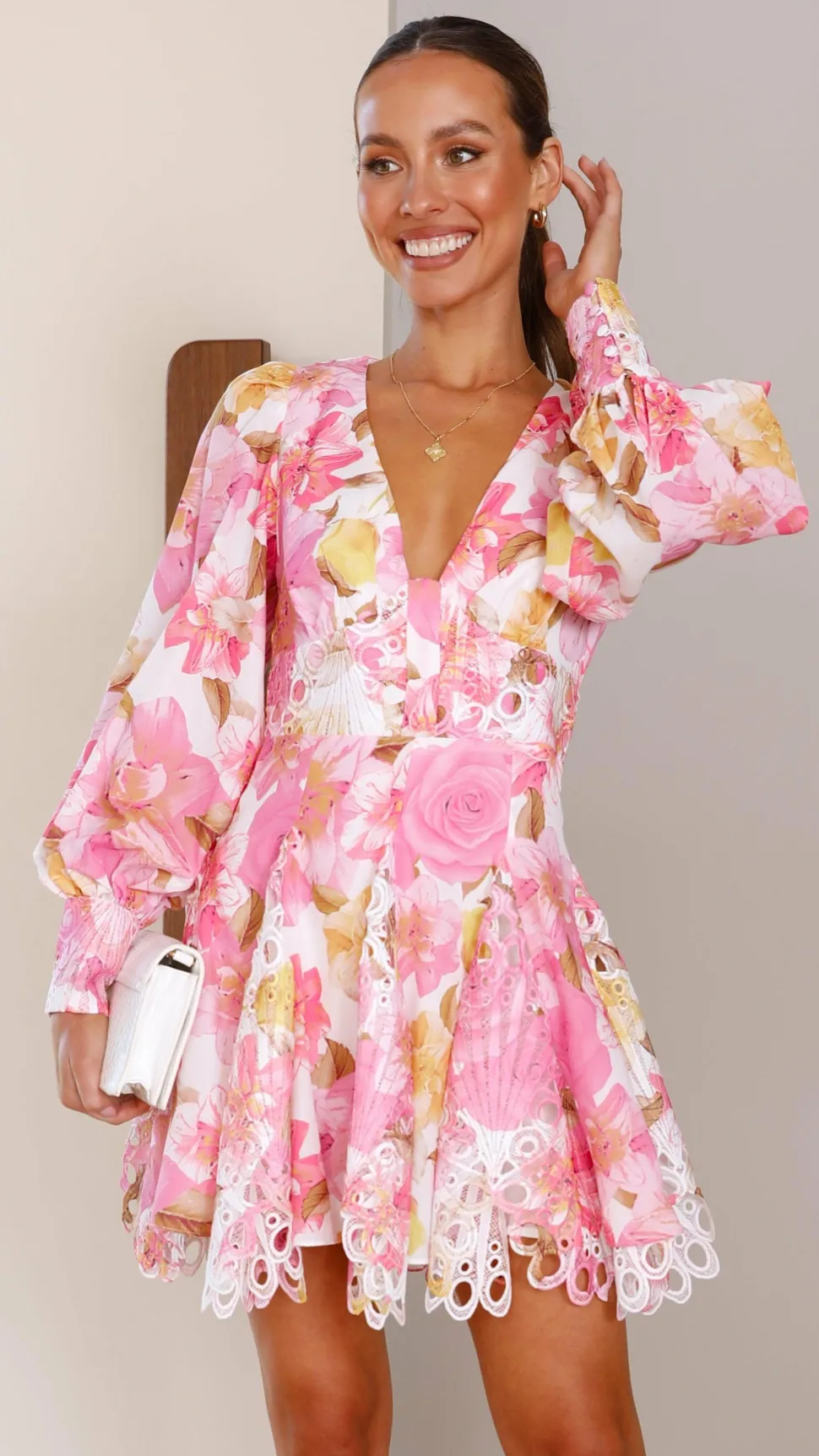 This sophisticated mini dress features a V-neckline and long balloon sleeves with buttoned cuffs. It includes an invisible back zipper, a wide waistband, and delicate lace accents. Partially lined with rayon, it combines elegance with comfort.