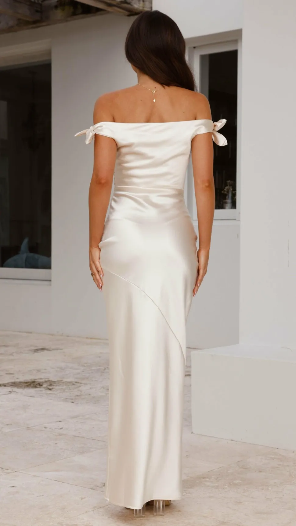 Turn heads and feel confident in the Frida Maxi Dress. This elegant style is perfect for bridesmaids or events. Its stunning off-the-shoulder design is complemented by a tie shoulder detail, adding a touch of sophistication. Just pair it with minimal jewelry, strappy heels and a clutch for a luxe finish.