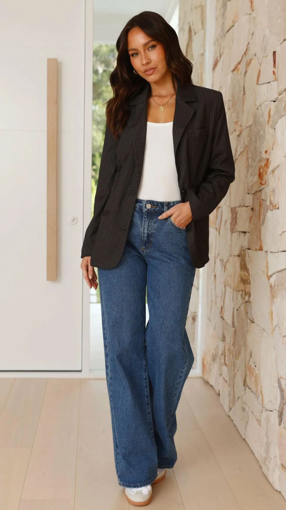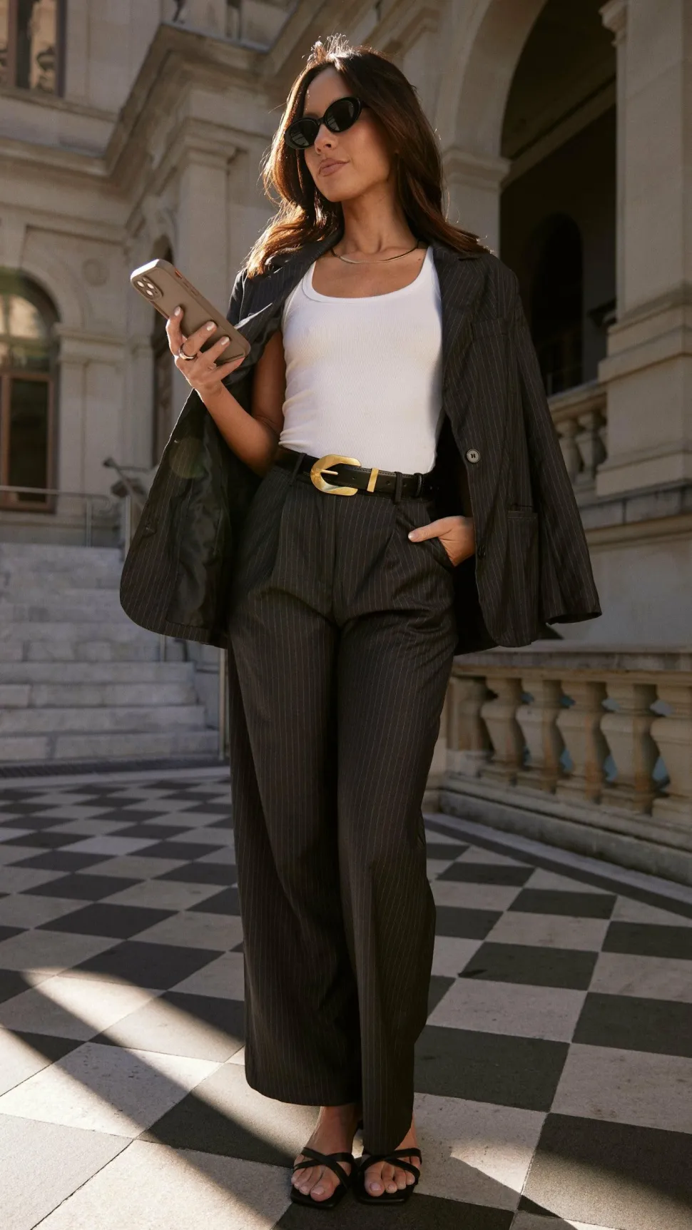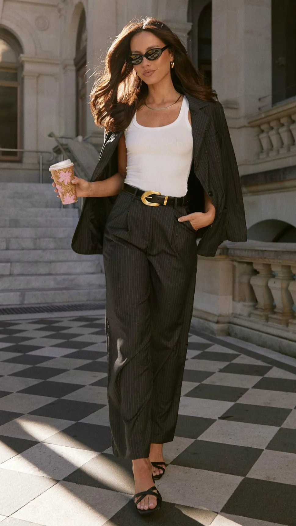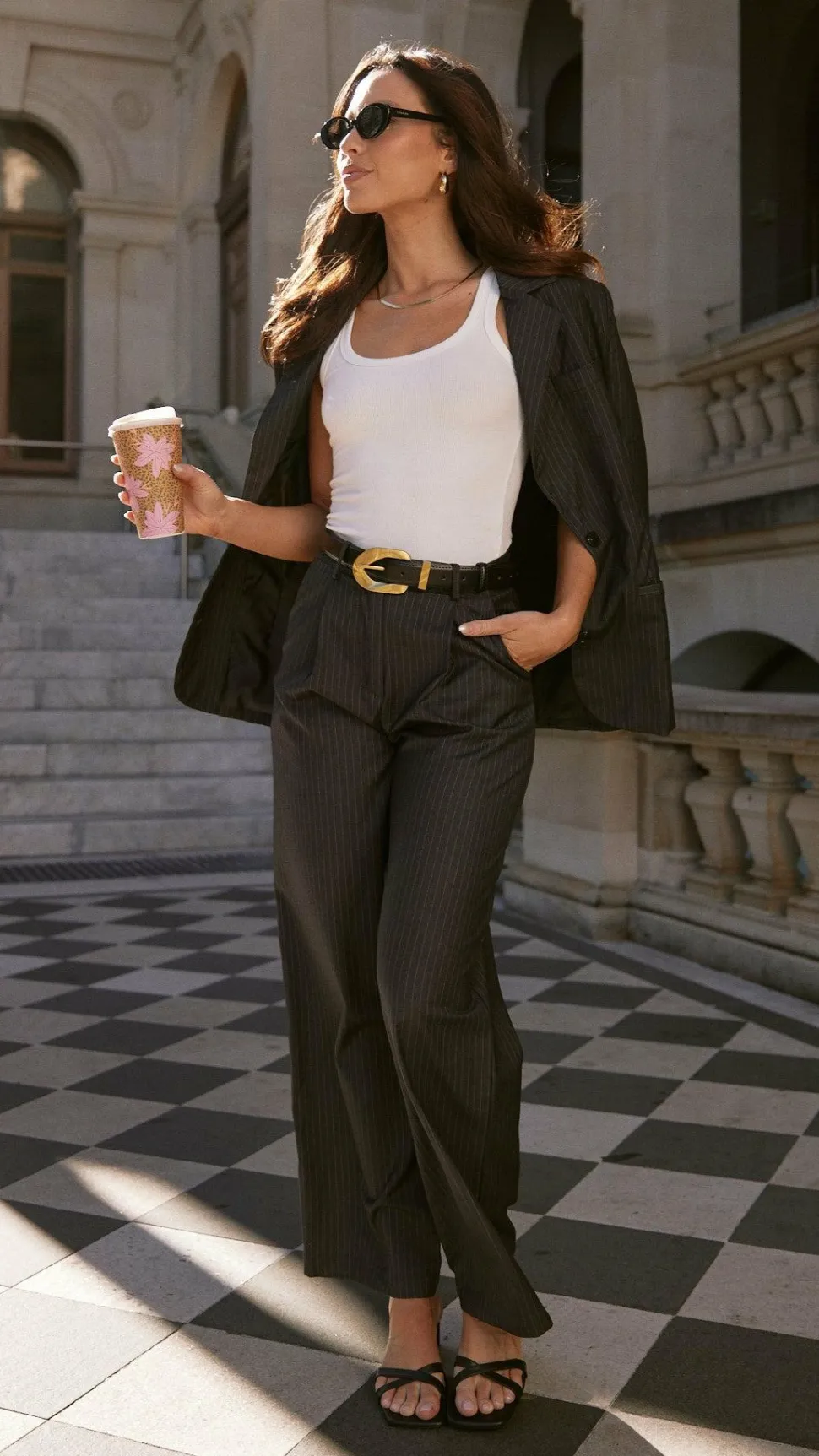 Get the look! Rotate Rib Singlet – White,Evelyn Belt – Black,Yahara Heel – Black &Hadrian Pants – Charcoal Pinstripe