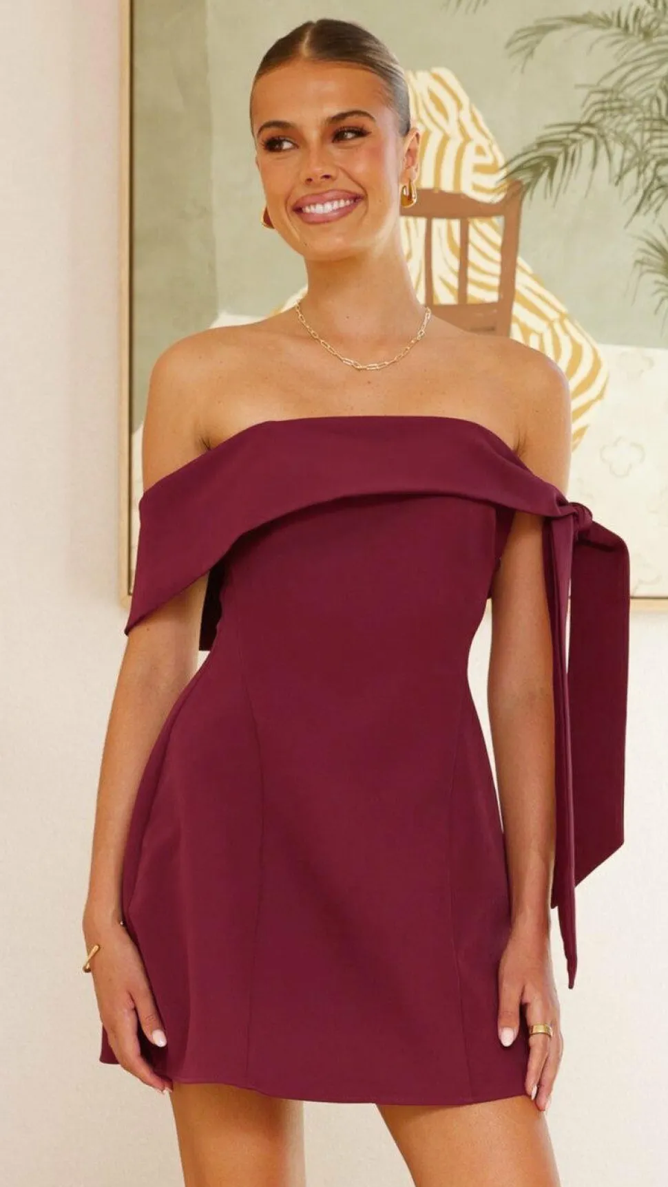 – Strapless design with bow shoulder detail