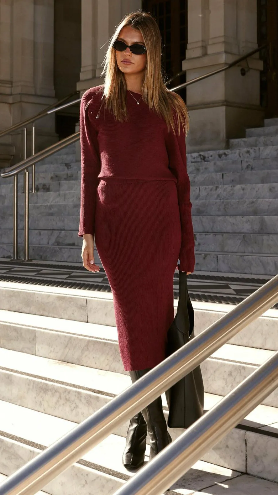 Get the look! Iluka Knit Skirt – Burgundy & Corbin Boot – Black