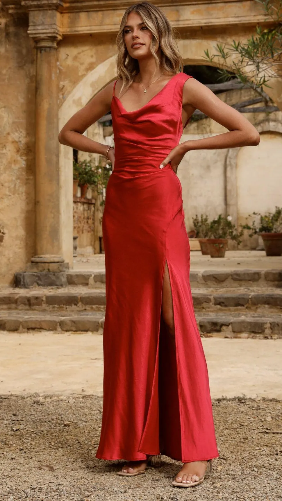 This maxi dress features an asymmetrical cowl neckline and a twisted strap design, complemented by adjustable spaghetti straps for a perfect fit. It includes an invisible back zipper, side gathering, and a leg split, creating an elegant and refined silhouette.