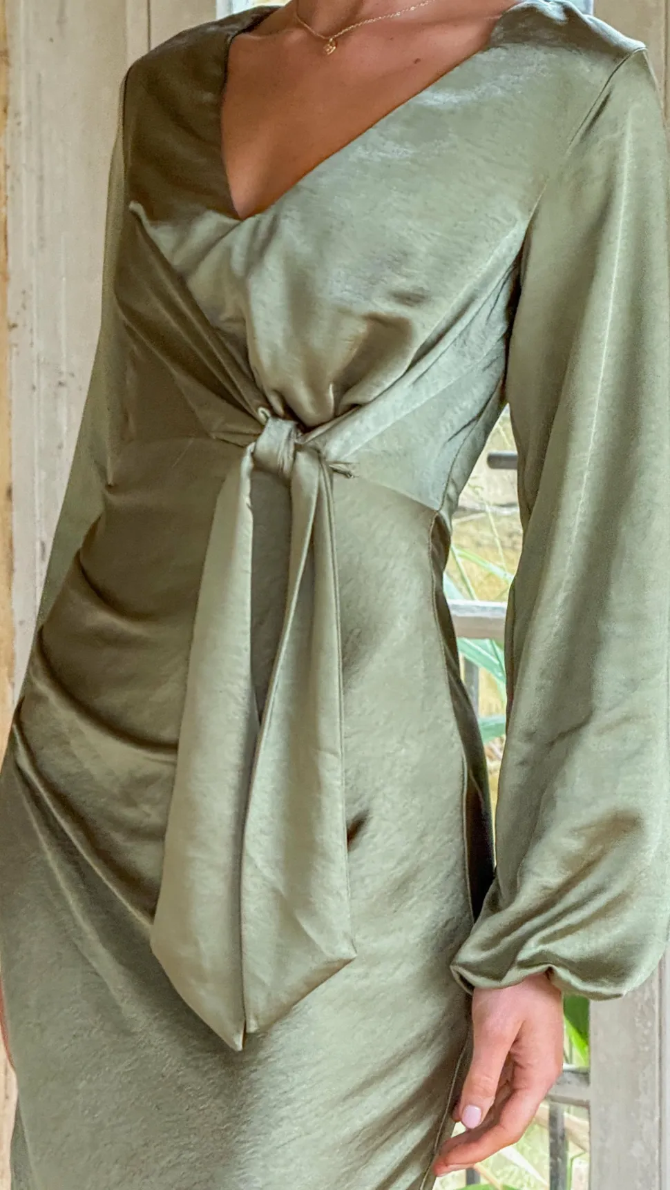 This elegant maxi dress features a flattering V-neckline and a stylish front tie detail. Designed with long balloon sleeves and an invisible back zip for a seamless look, it also includes side gathers and a leg split for added movement. Fully lined for comfort, this olive dress offers a refined silhouette perfect for any occasion.