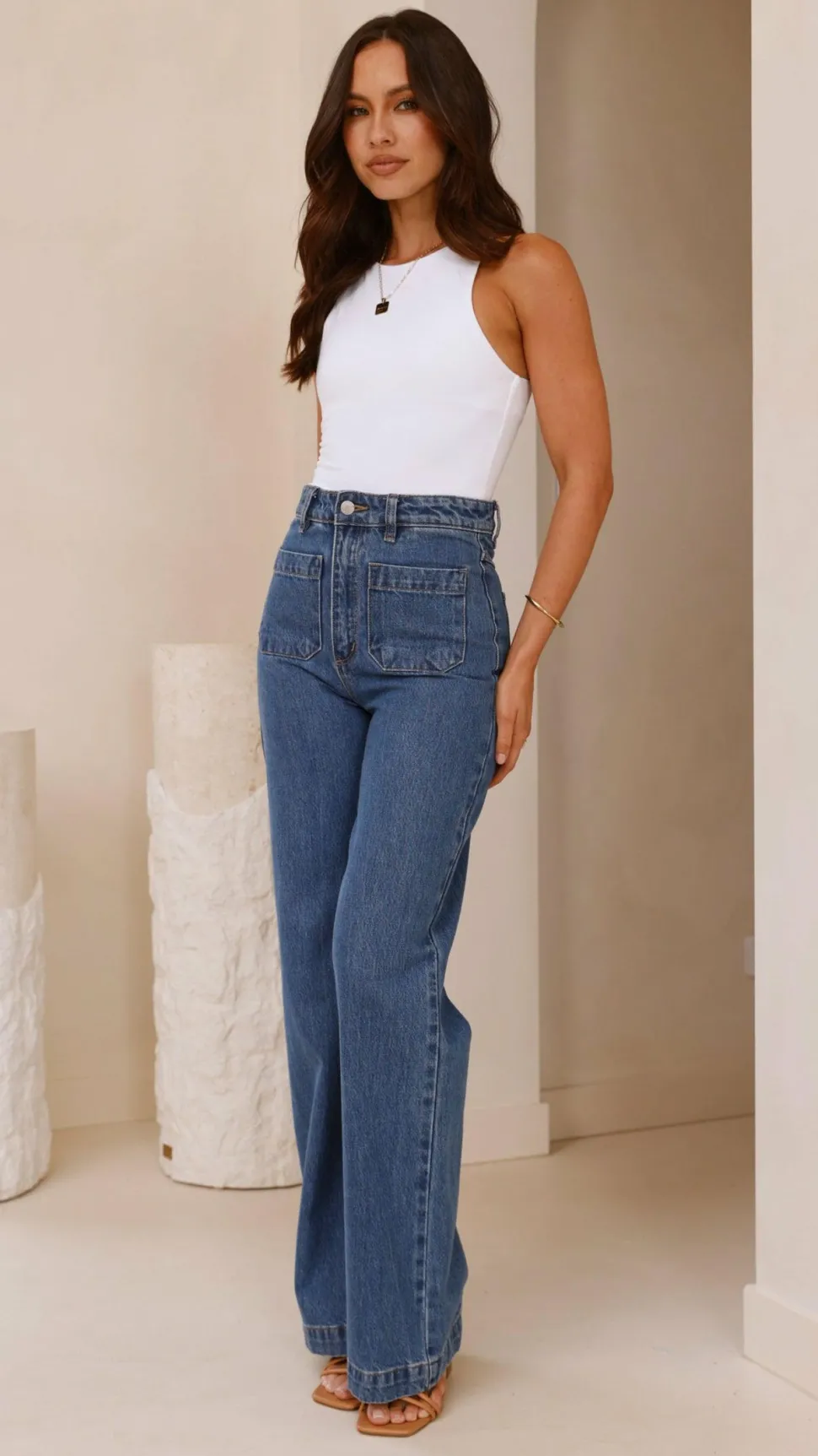 Get the look! Rollas Sailor Jean Long – Ashley Blue, Zinnia Sandals – DesertandAbrand Venice Short – Esmerelda