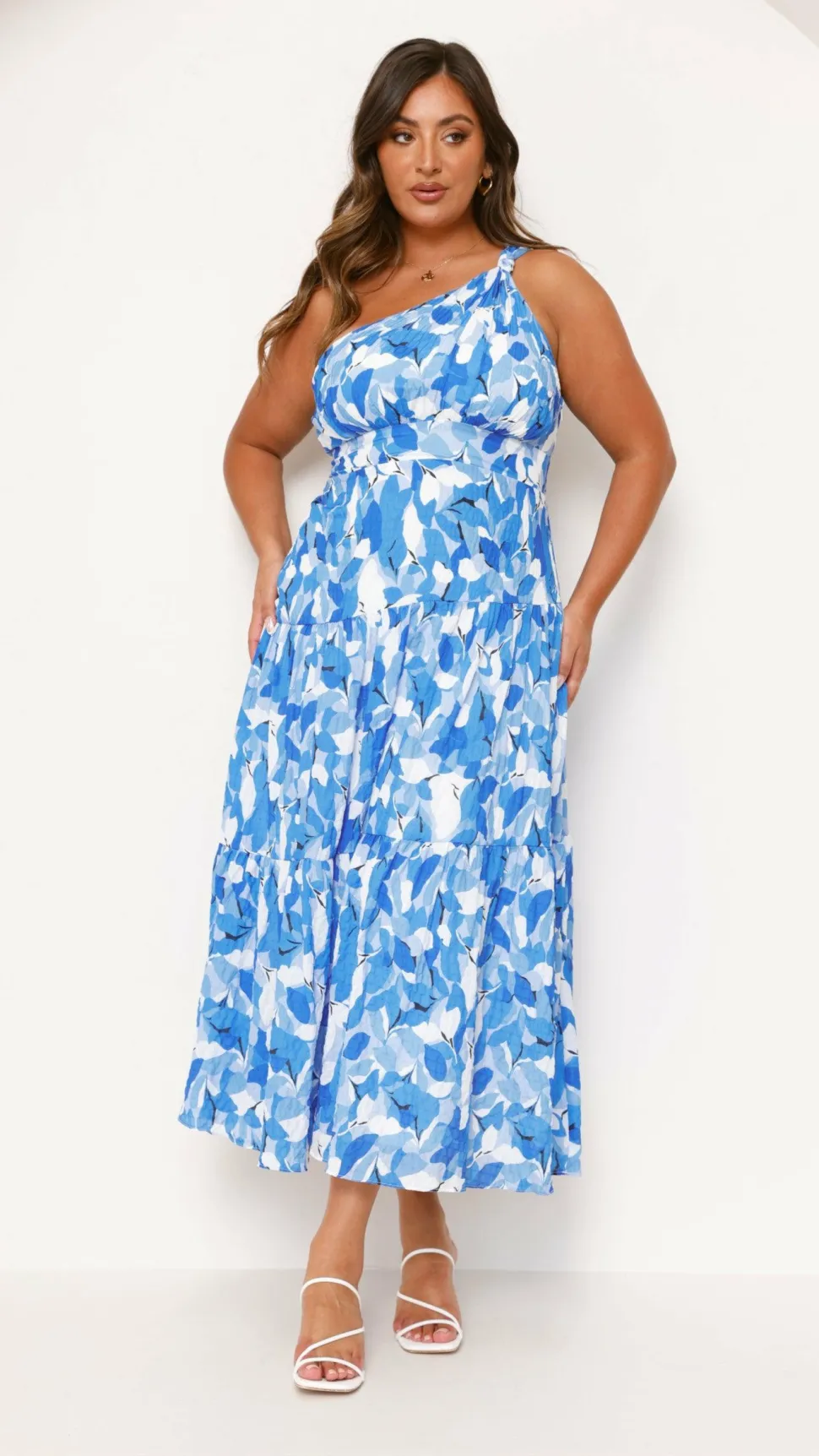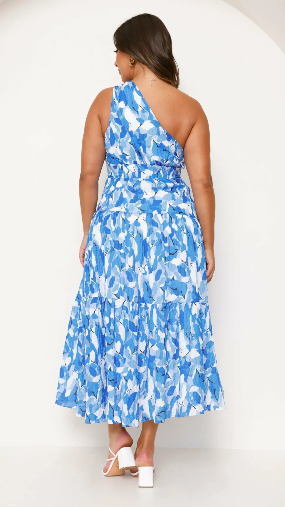 Step into fun with the Jayma Maxi Dress in Blue Floral. This playful maxi features a flirty one-shoulder design with a charming knot detail on the strap. The shirred back offers a comfy fit, while the gathered bust and waist add a touch of whimsy to your silhouette. Perfect for sunny days and lively gatherings, this dress brings a fresh, joyful vibe to your wardrobe.
