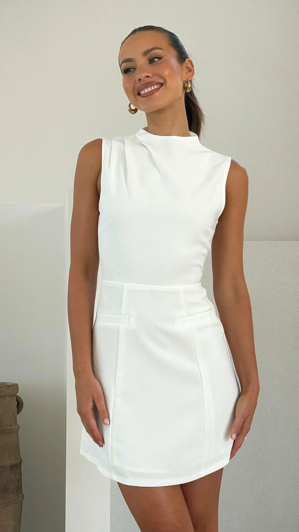 – High neckline with pleat detailing