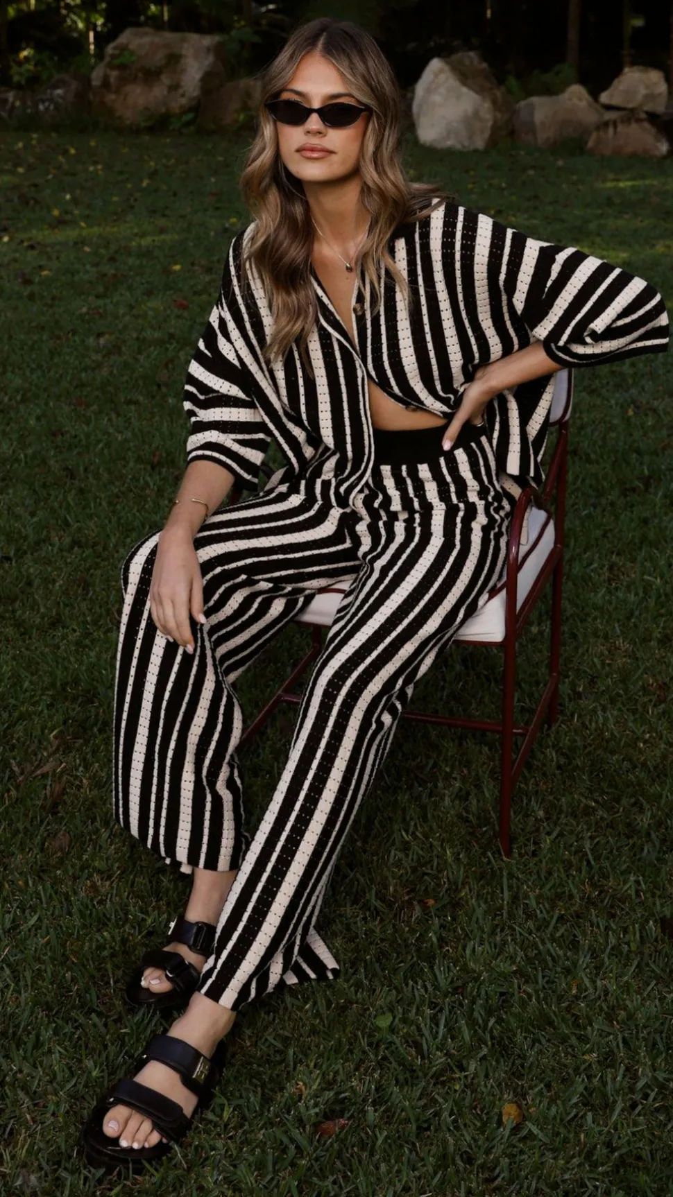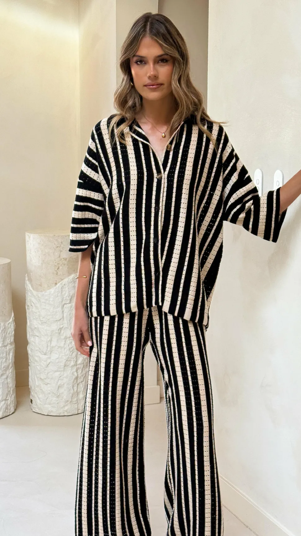 Get the look! Layla Button Up Knit Shirt – Black & Amylee Slide – Black