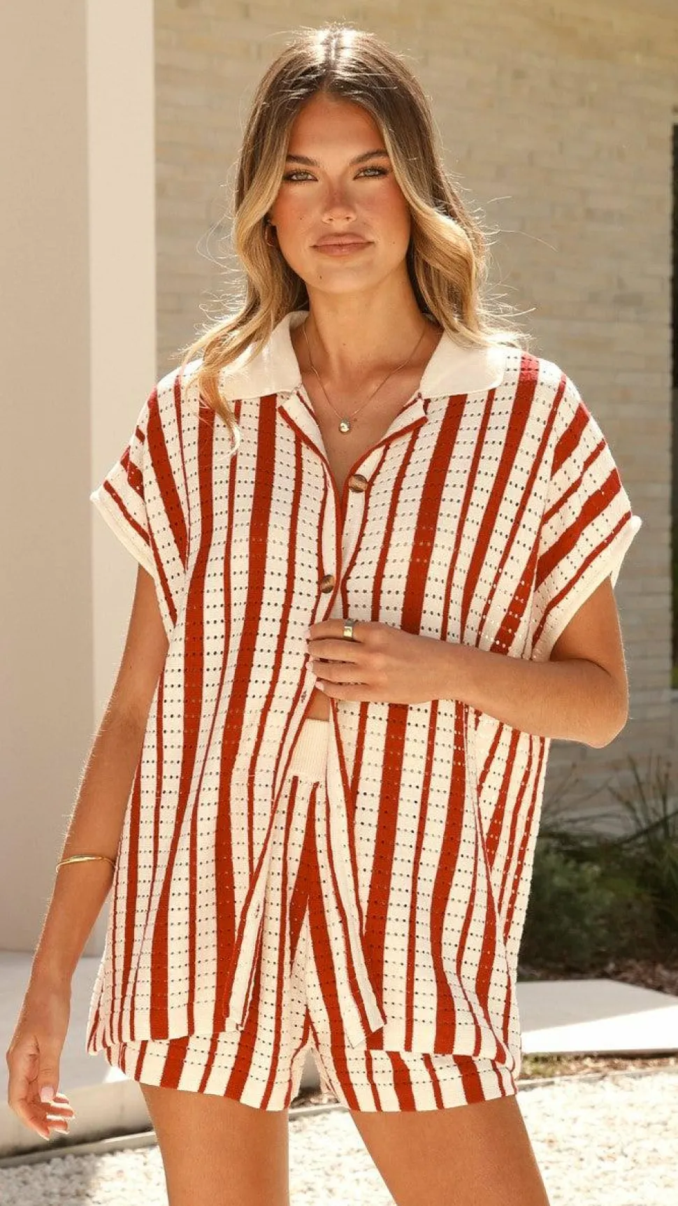 Get the look! Leonie Knit Shorts – Red & Amaya Slide – Clay