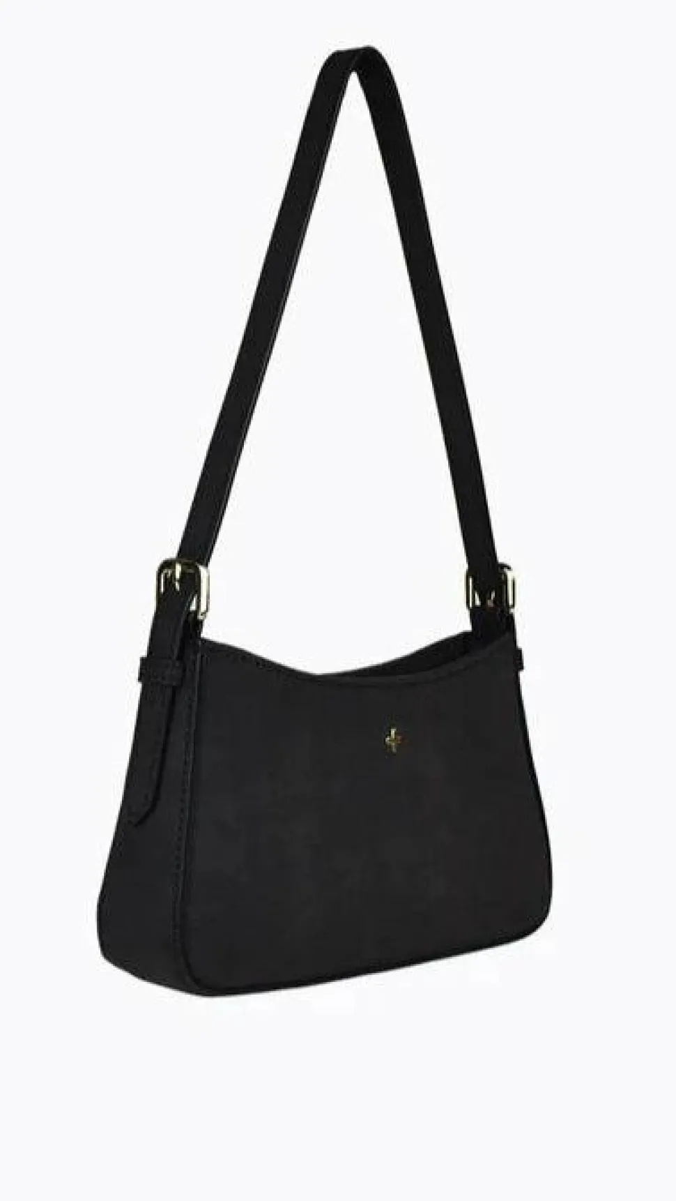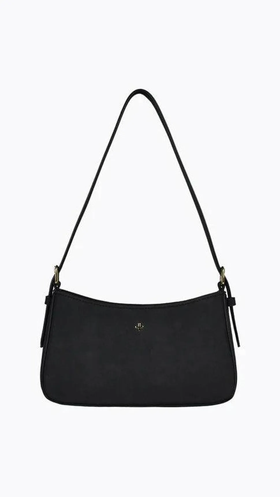 – The bag features a fixed, adjustable shoulder strap with buckle detail and gold hardware.