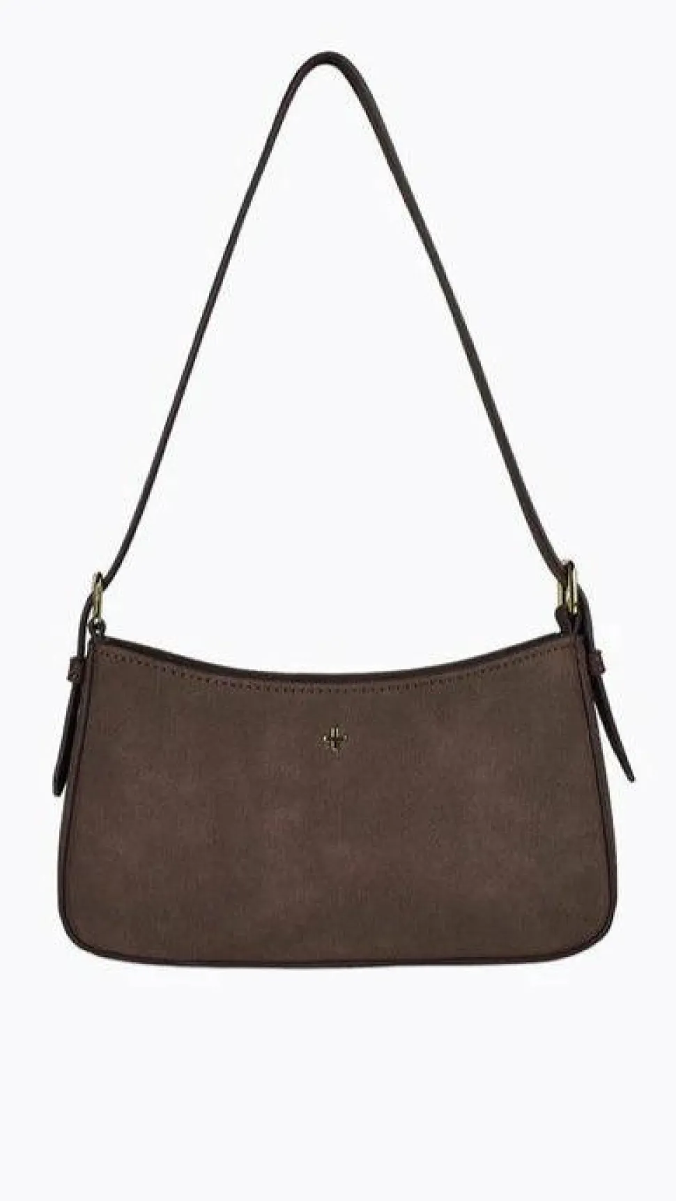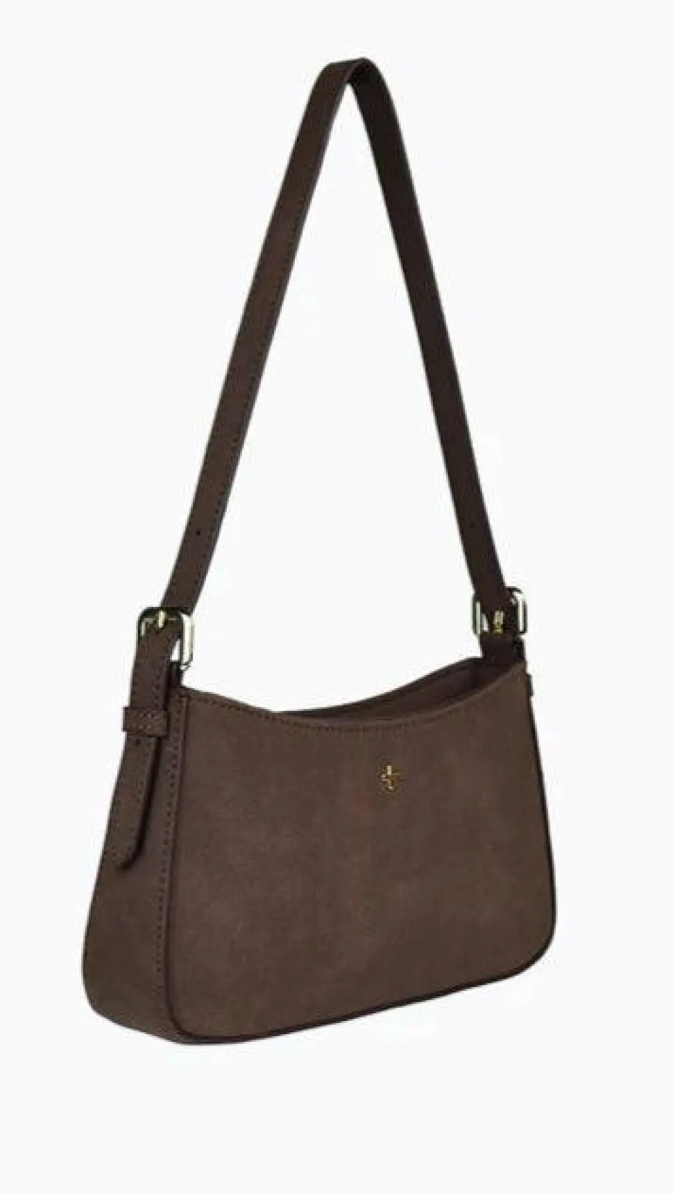 – The bag features a fixed, adjustable shoulder strap with buckle detail and gold hardware.