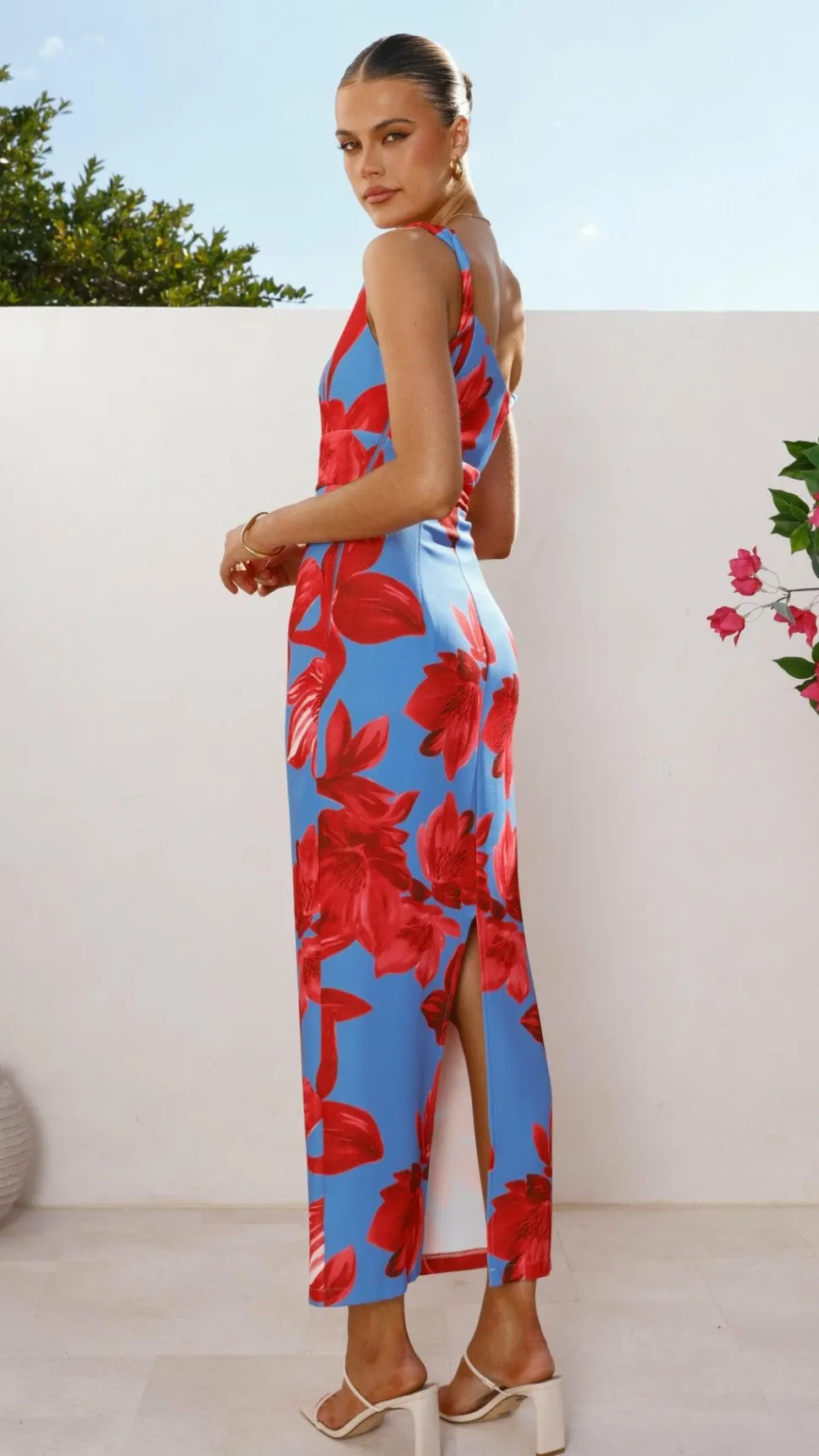 Elevate your wardrobe with the Lorina Maxi Dress in a striking red and blue floral pattern. This sophisticated piece features an elegant off-the-shoulder design complemented by a delicate twist sleeve detail. An invisible side zipper ensures a seamless fit, while the center back leg split adds a subtle touch of allure and movement. Perfect for refined occasions, this dress combines timeless style with modern accents for a graceful silhouette.