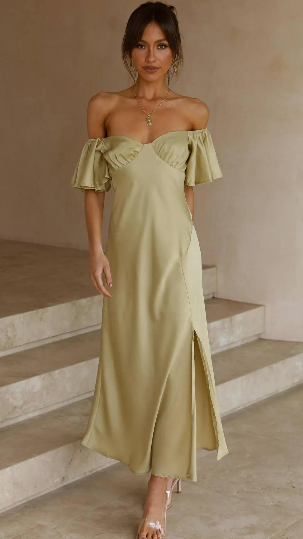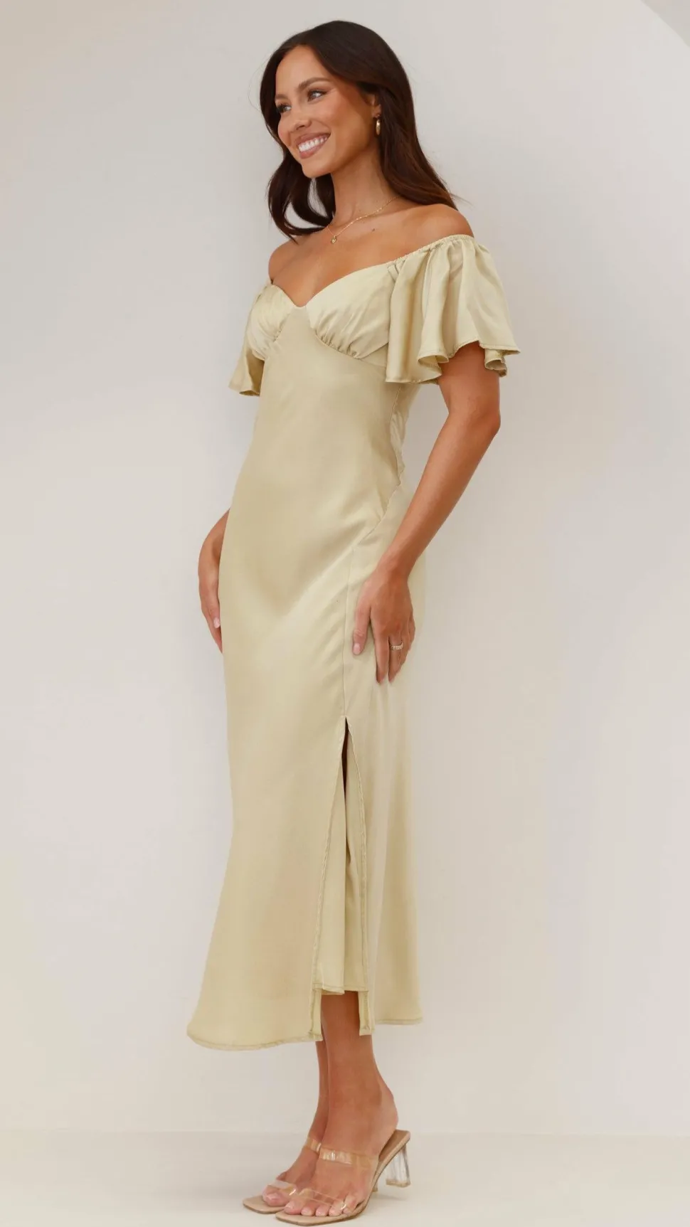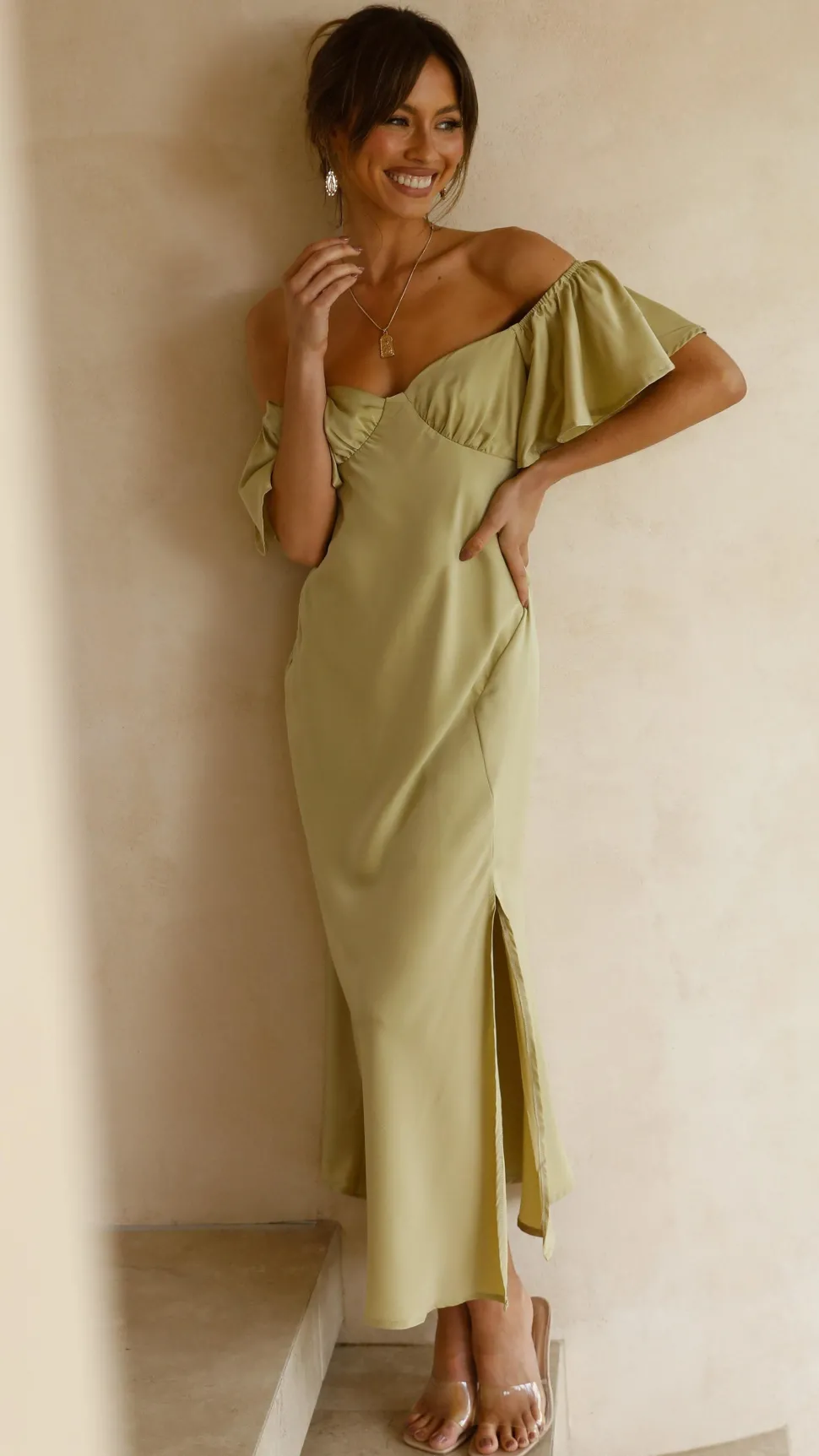 Our Louisa Dress features beautiful butterfly sleeves, flattering off shoulder design, pleated bust and a flirty front slit. This beautiful floaty design takes elegance to the next level – you’ll be sure to turn heads in this number. Pair this piece with ourBalton Mules – Sugar BrownandHollow Circle Necklace – Gold