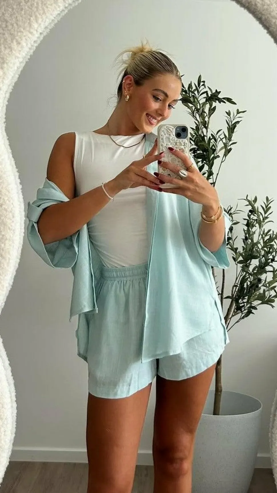 Get the look! Luna Shorts – Blue & Yaelle Sandals – Teak