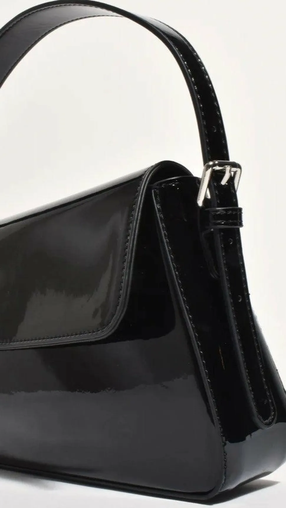 The Maisie High Shine Handbag offers a sleek, sophisticated look with itspatent black exterior that will elevate your wardrobe. Perfect for day-to-night style, this handbag boasts ample storage and a stylish design.