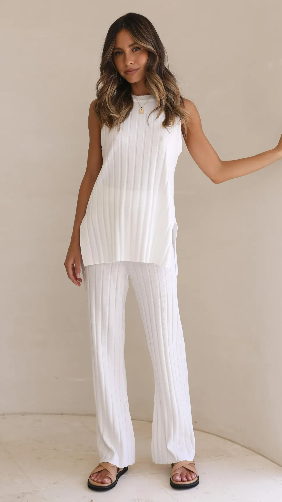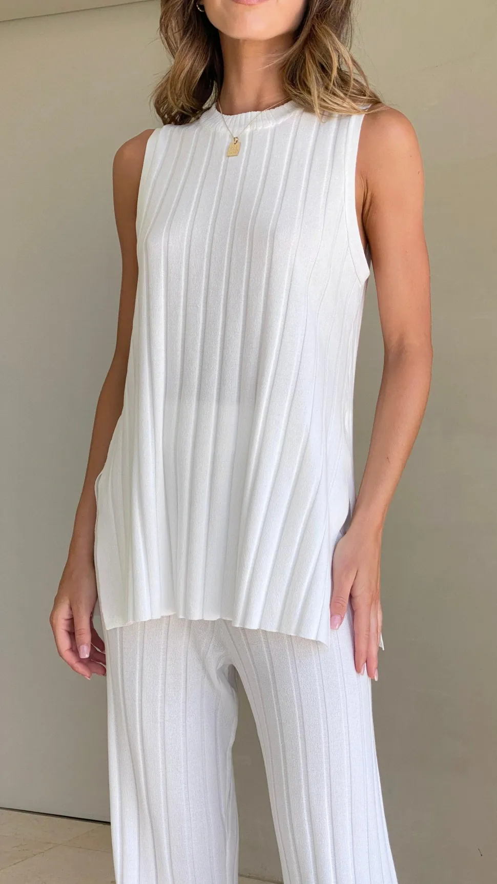Experience ultimate comfort with the Megan Knit Top in white, featuring stretchy ribbed fabric that moves with you. Its relaxed fit and side slits provide a flattering silhouette, while the sleeveless design keeps you cool and stylish all day.