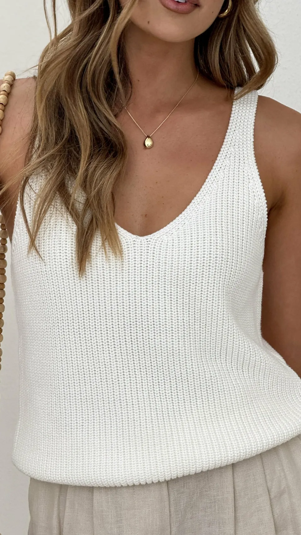 This sleeveless Neelia Top in White features a scooped neckline and a relaxed fit for effortless style. Crafted from 100% cotton, it offers a soft knit texture and ribbed detailing at the hem, combining comfort with subtle elegance.