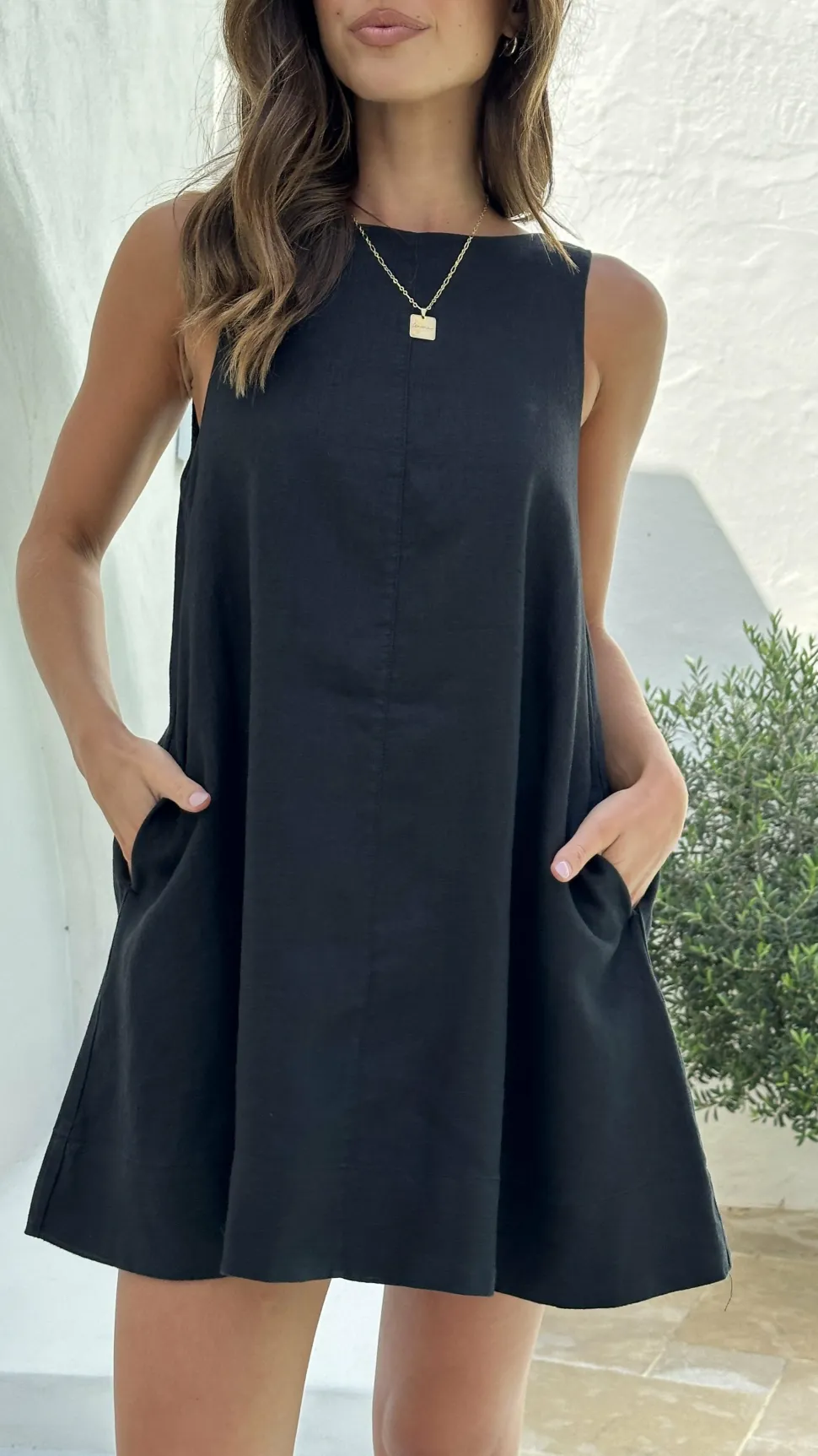 The Nemi Linen Dress is made from a breathable 100% Linen that has a soft hand feel. This silhouette is billowy and finishes mini in length. Features include a scoop neckline, with a low scooped back. This dress is fully lined.