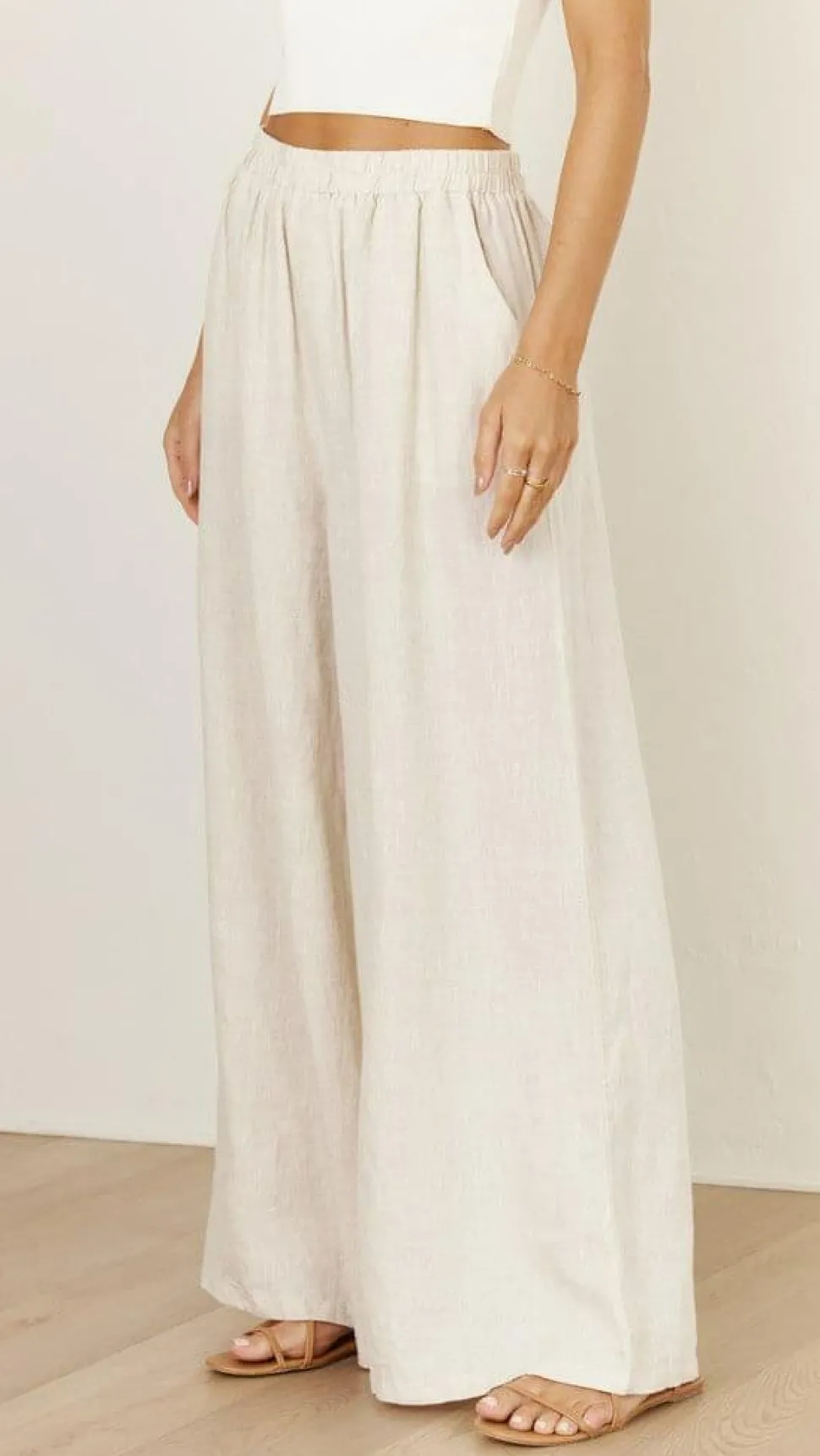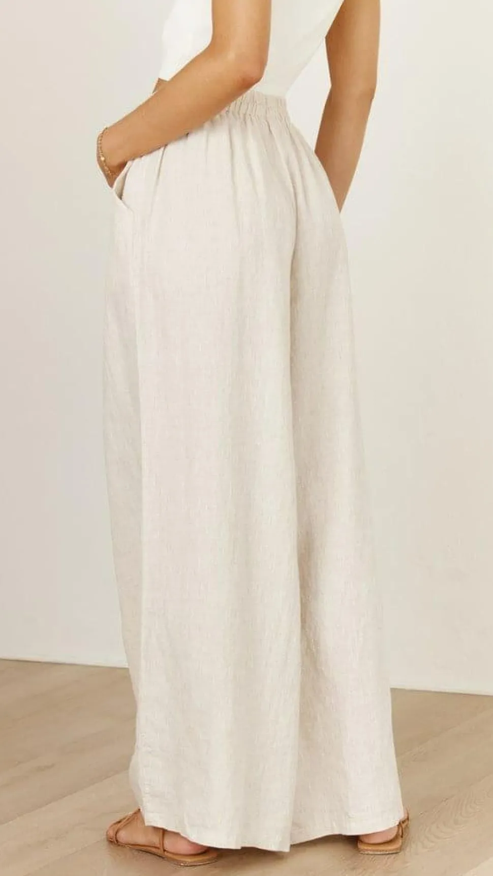 These pants boast a comfortable elastic waistband, an elegant wide-leg cut, convenient side pockets, and are made from high-quality linen fabric.