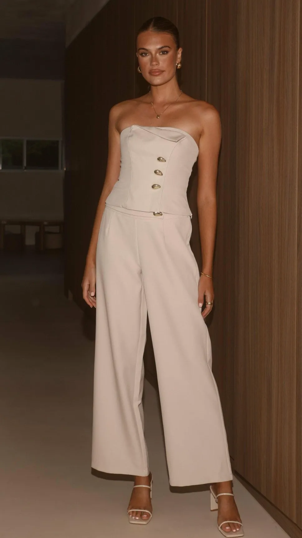Get the look! Payton Strapless Top – Beige & Hopper Heel – Bone