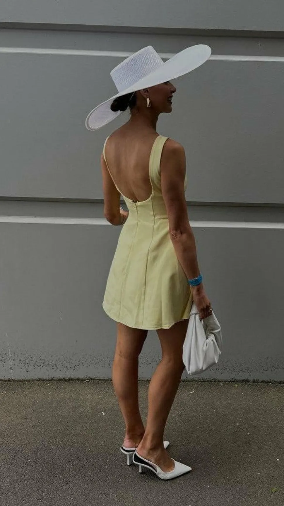 This yellow mini dress features a sleeveless cut with a high neckline and a scooped back. It is tailored at the waist for a flattering fit, includes an invisible zip at the back, and is fully lined for comfort.