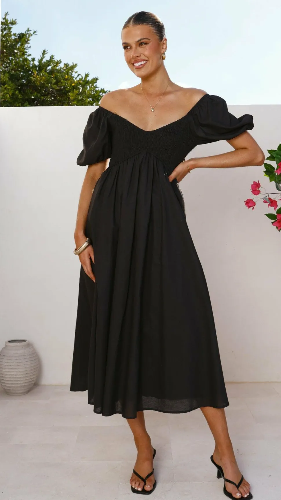The Sahirah Midi Dress in black combines elegance and comfort with its midi length and shirred bust detail for a tailored fit. Featuring elasticated puff sleeves and a refined V-neckline, this dress offers a sophisticated look ideal for any stylish occasion.