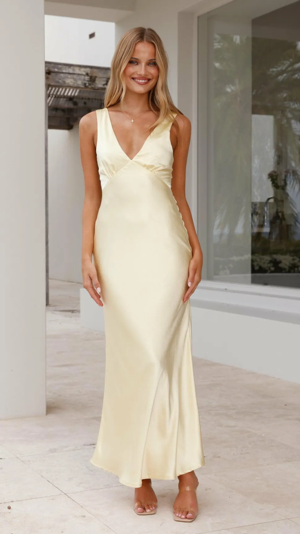 The Sofia Maxi Dress in Yellow features a gathered bust detail and a V neckline, providing a flattering and stylish look. With a maxi length and thick back straps, this dress offers comfort and support. The invisible side zipper makes for an effortless and seamless fit. Perfect for any occasion.