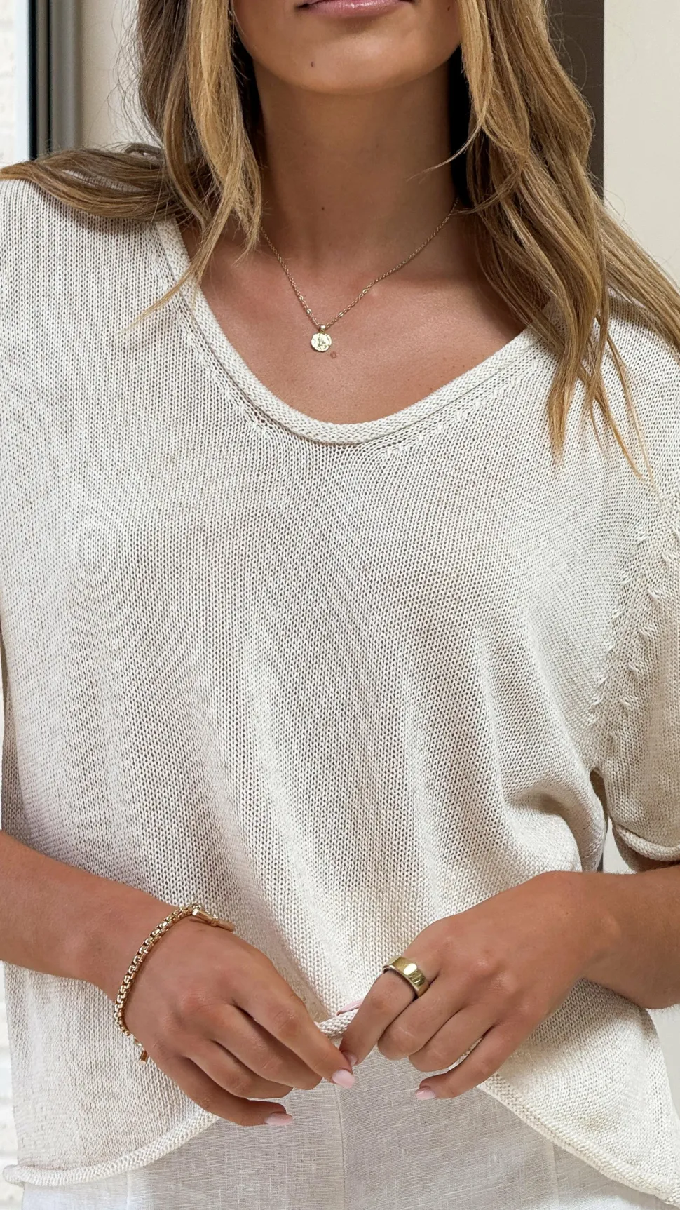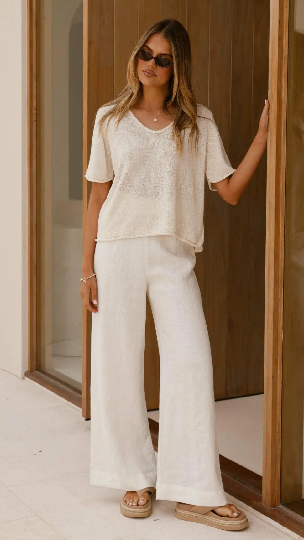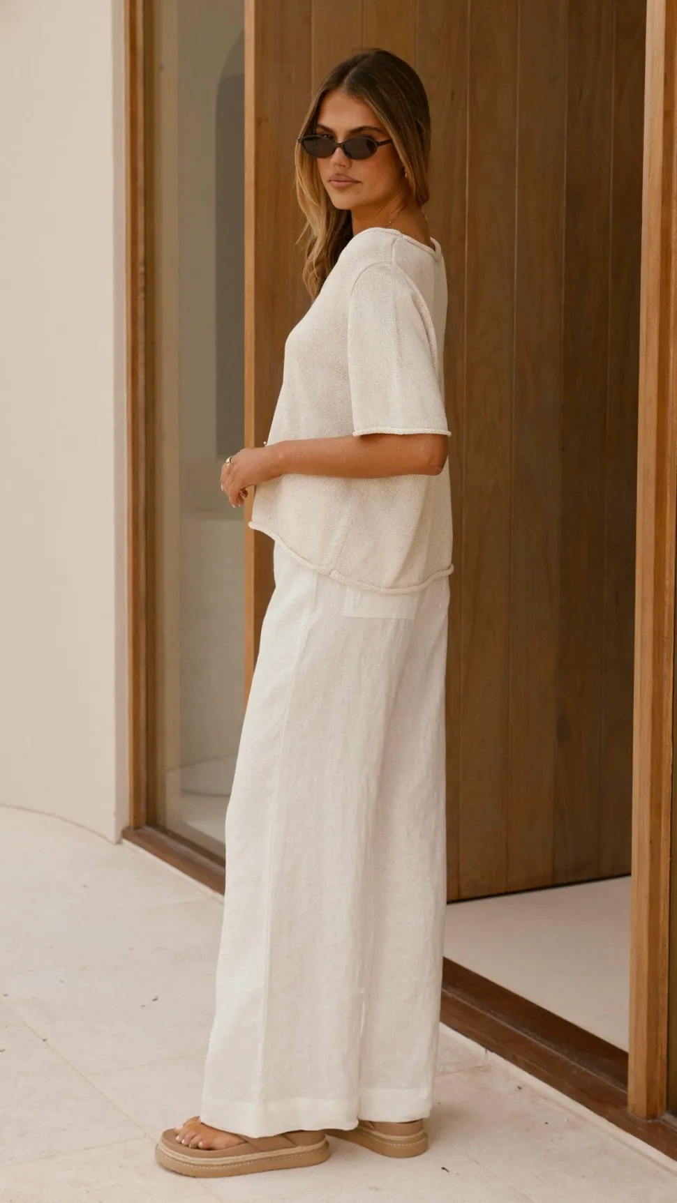 Get the look! Aila Thong – Light Clay & Imogen Button Pants – Cream
