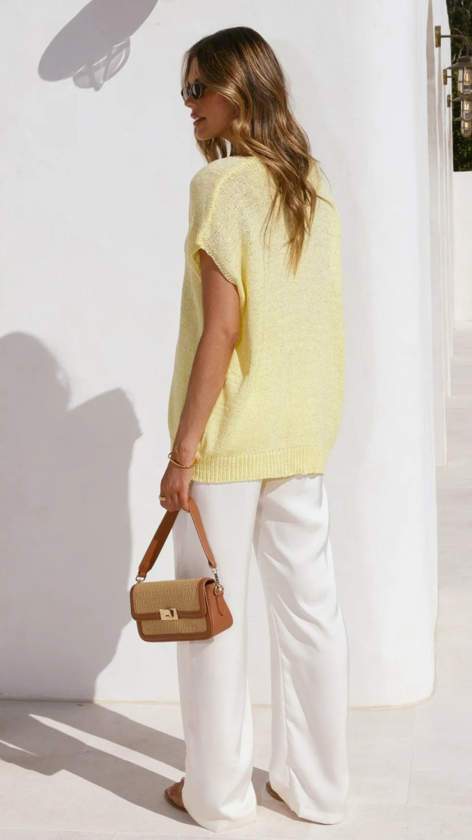 Get the look! Imogen Button Pants – Cream, Karah Pants – White & Yaelle Sandals – Teak, Amaya Slide – Clay