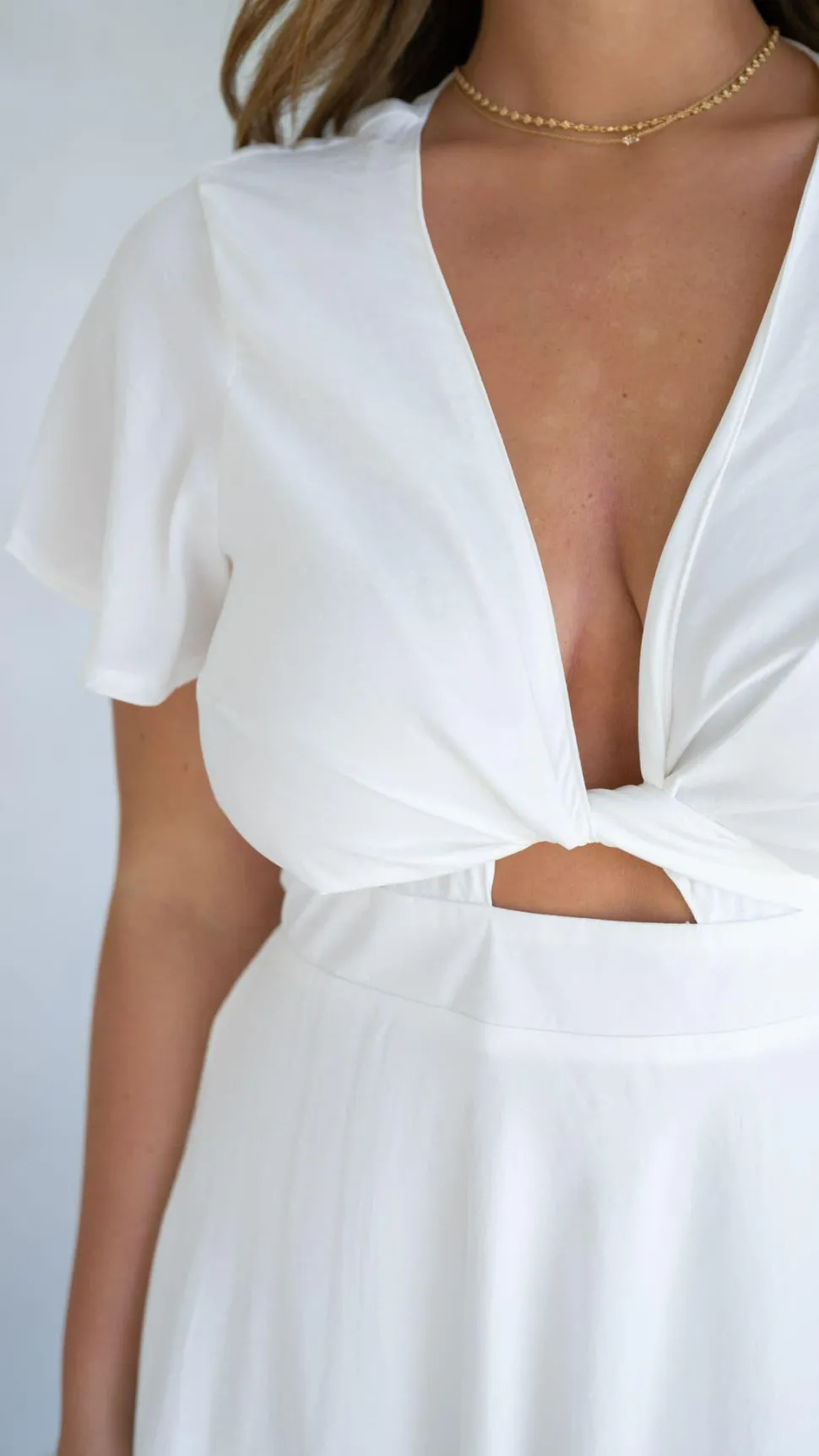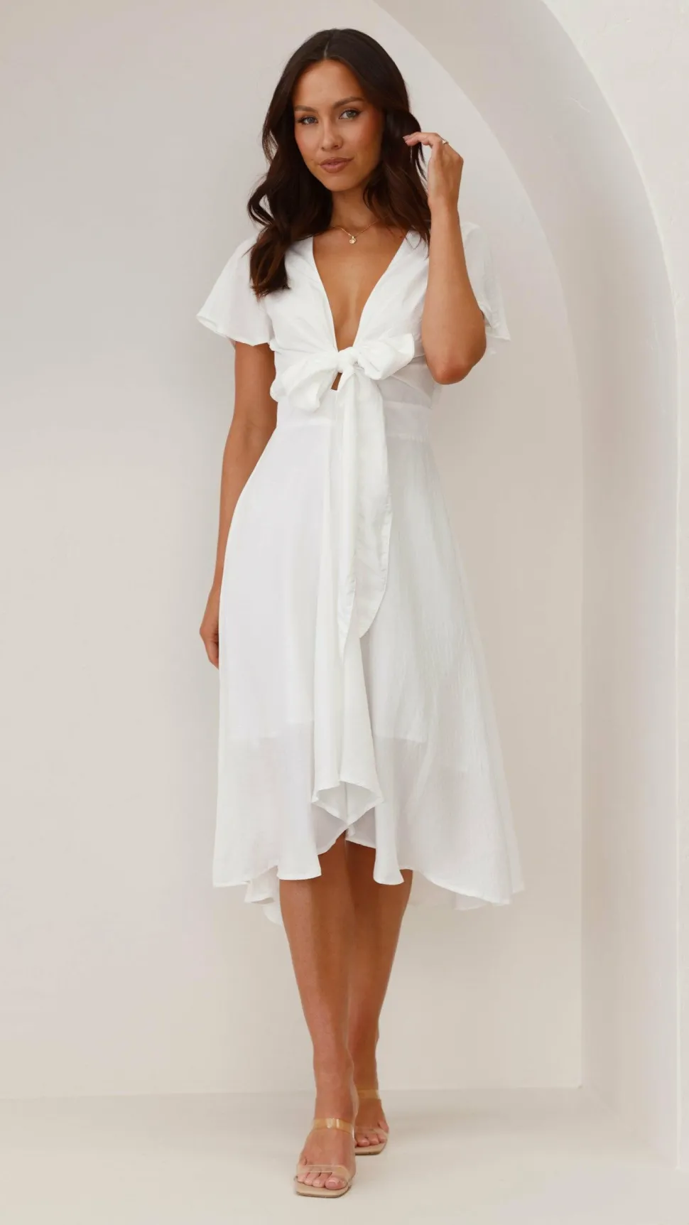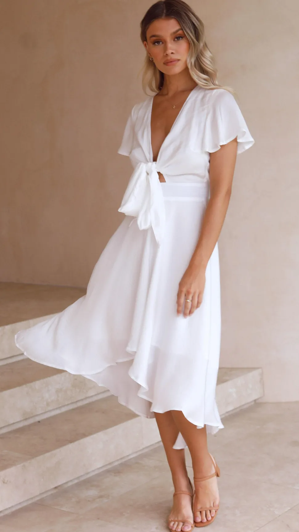 Our Sunny Daze Dress is a must have occasion piece, perfect for that upcoming party or wedding! This dress features butterfly sleeves, a soft satin feel and high low flowy skirt with a tight waistband. This piece will be your go to dress for impressing at any event, this gorgeous white tone is popular as a rehearsal dinner or engagement party dress!