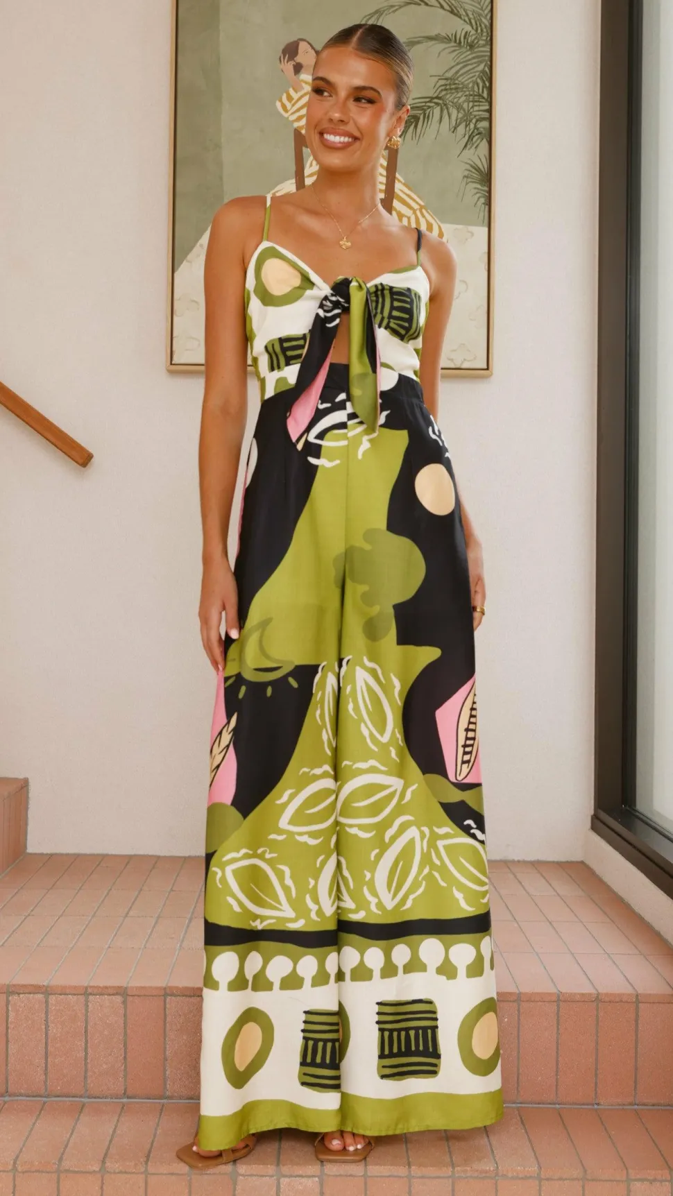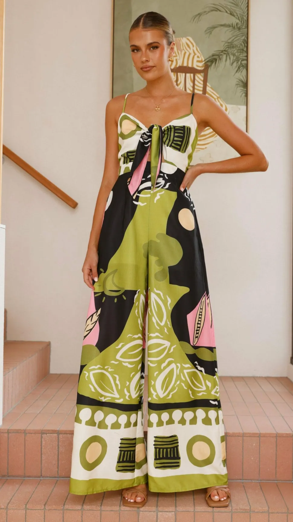 Featuring a tie-front detail, this jumpsuit includes a discreet back zipper and a flowing wide-leg silhouette. The shoulder straps can be adjusted for a perfect fit, complemented by a shirred panel at the back for added comfort and style.