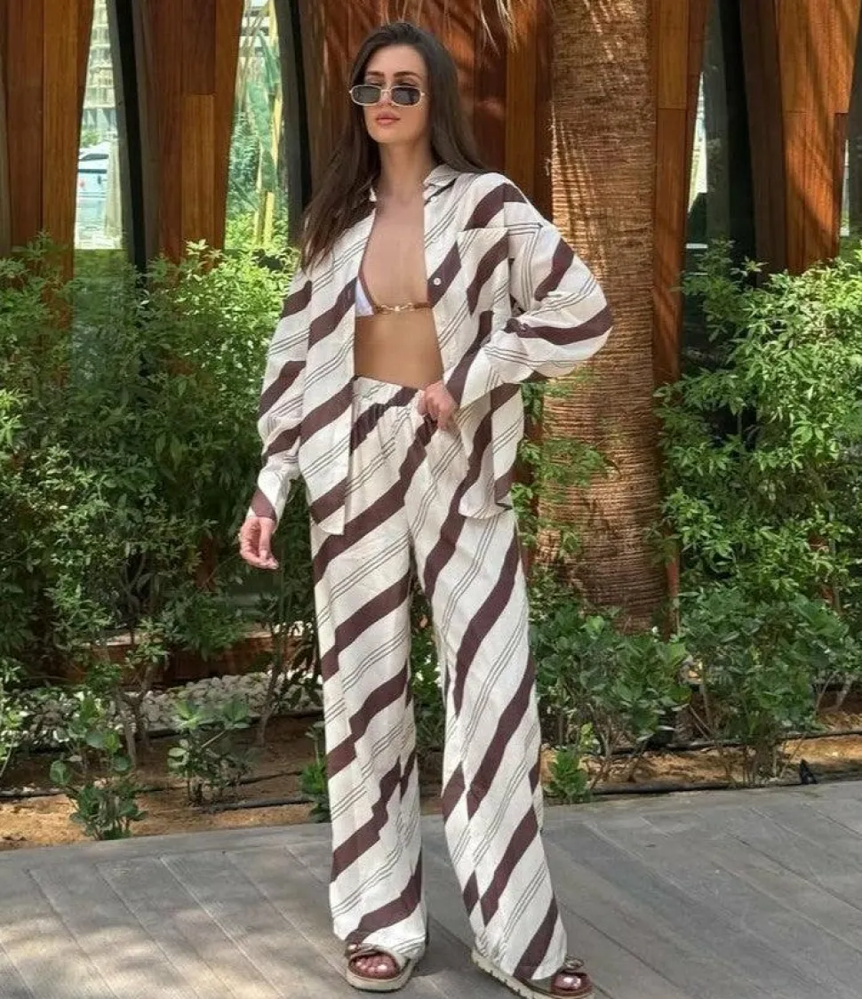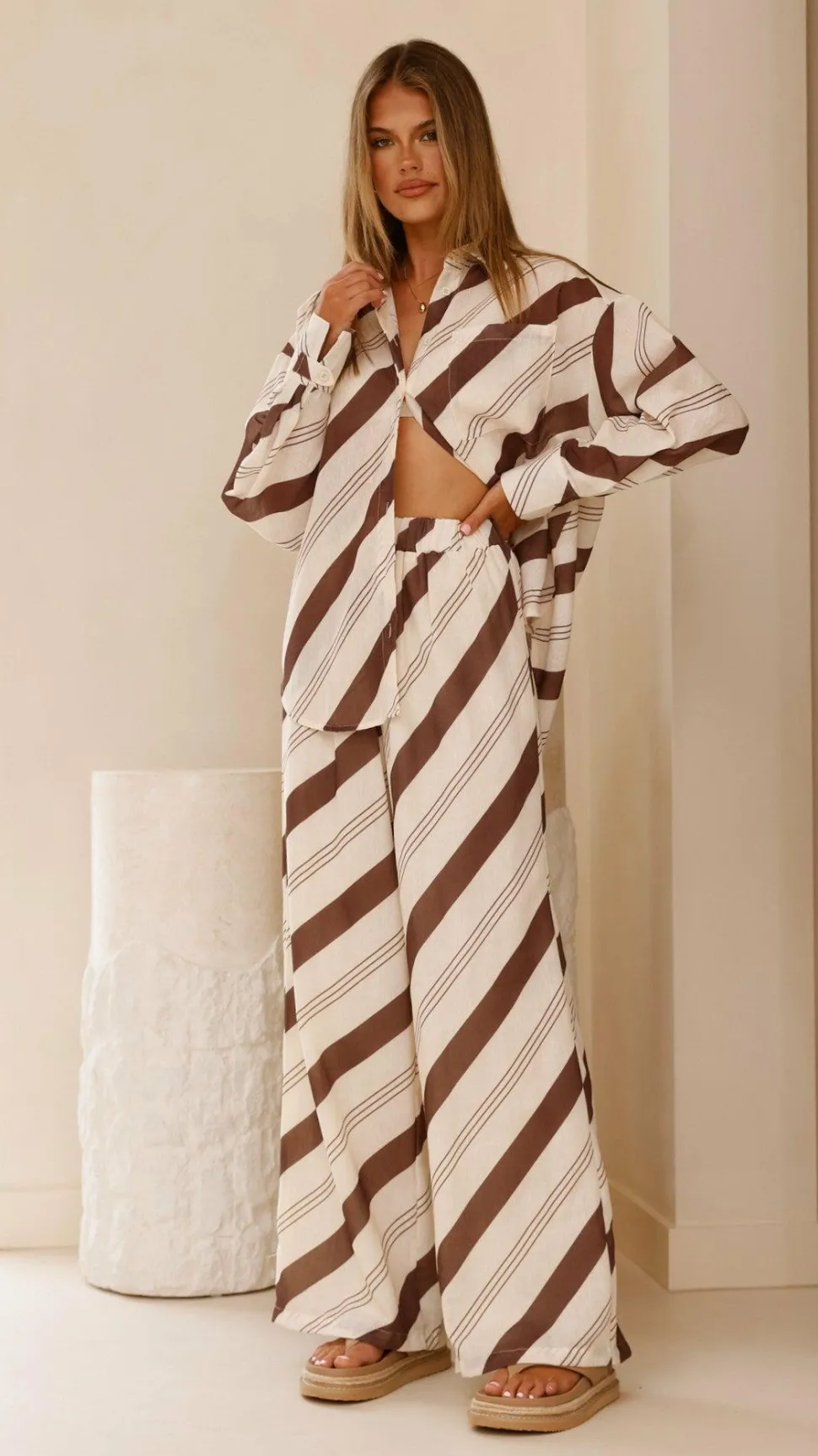 Get the look! Torrey Wide Leg Pants – Cream/Cacao & Aila Thong – Light Clay