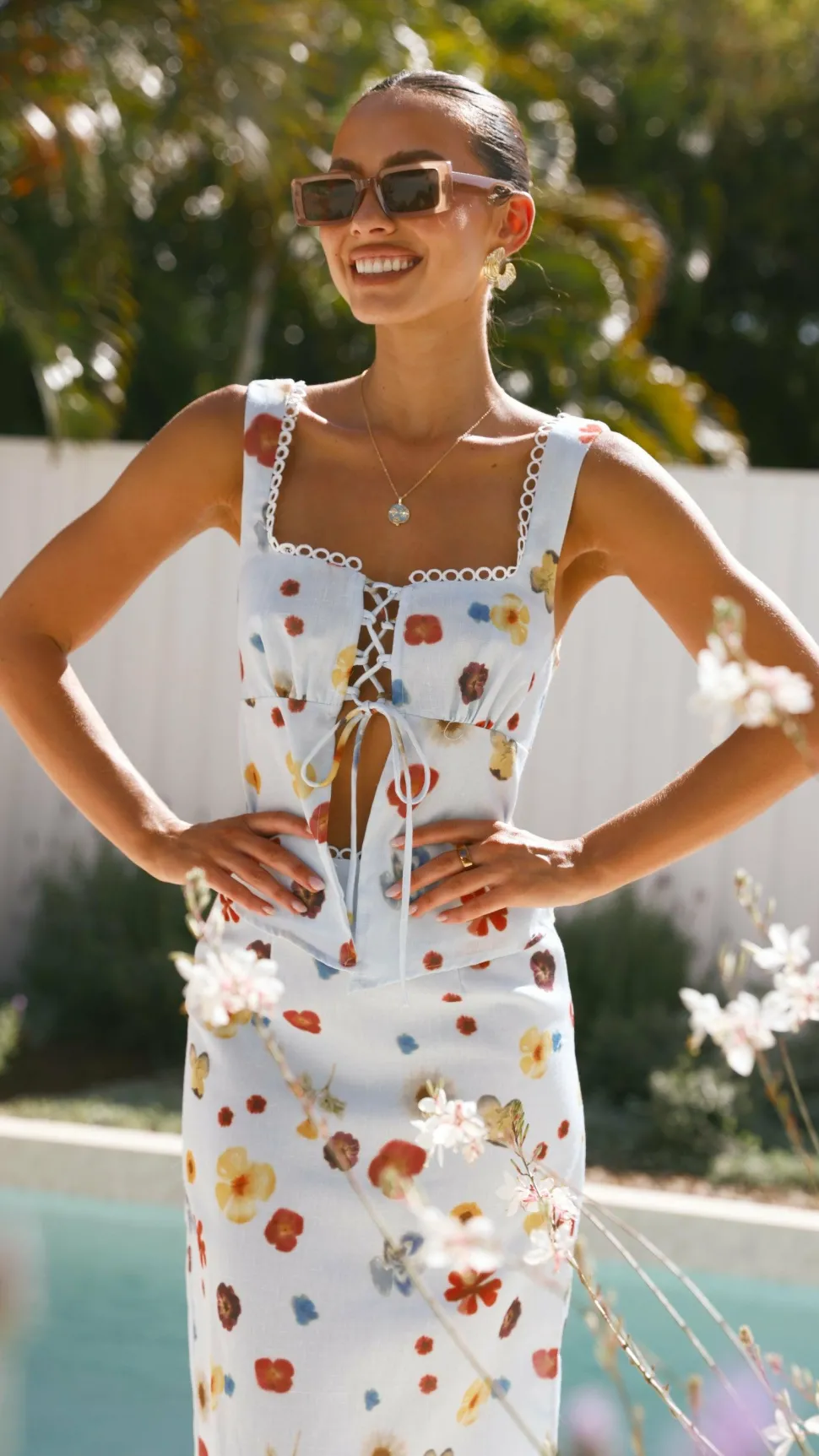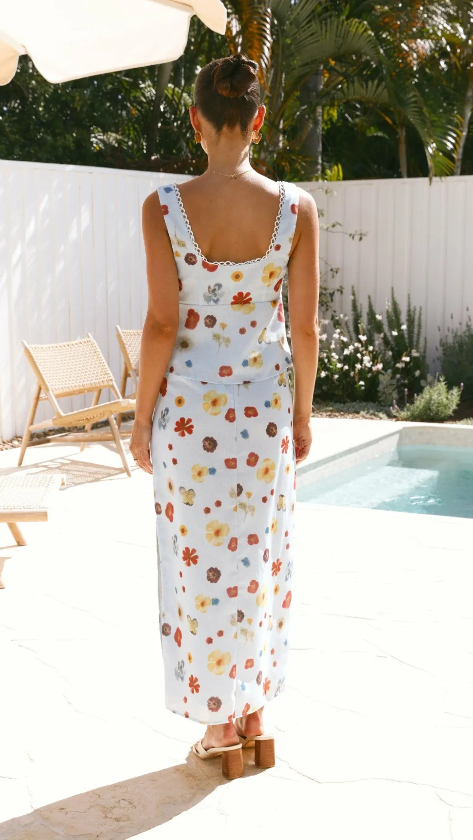 Get the look! Vaiana Skirt – Blue / Floral & Yahara Heel – Toffee