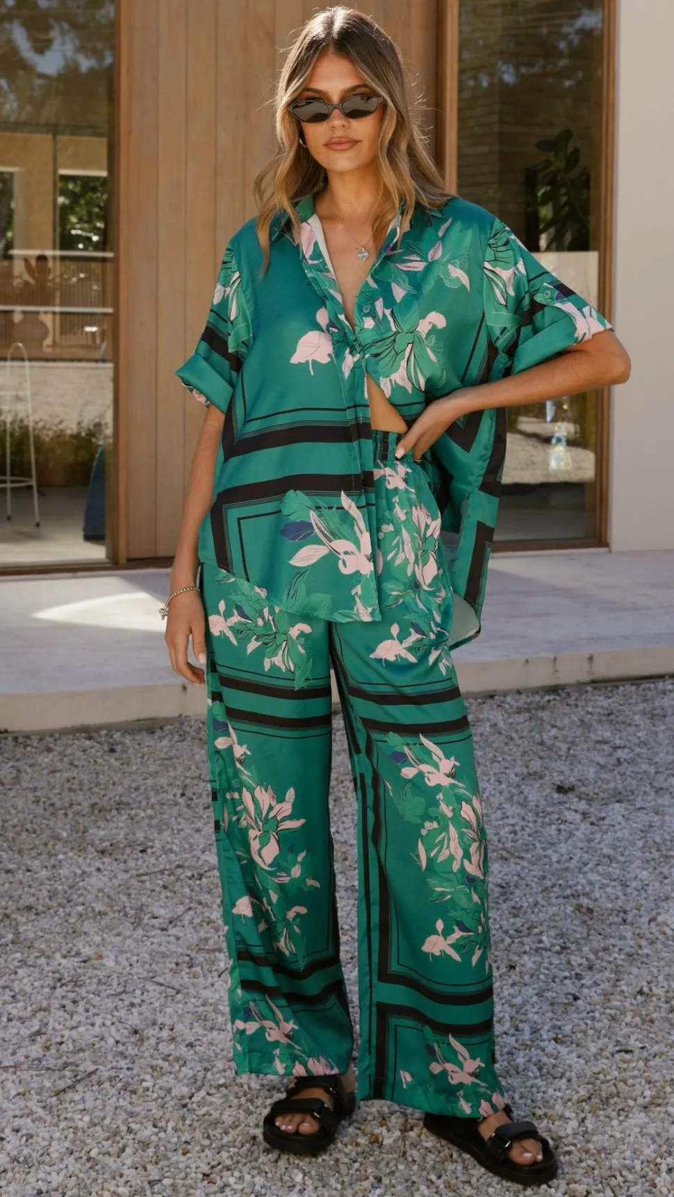 Get the look! Vallerie Button Up Shirt – Green/Pink Print & Zetland Slide – Black