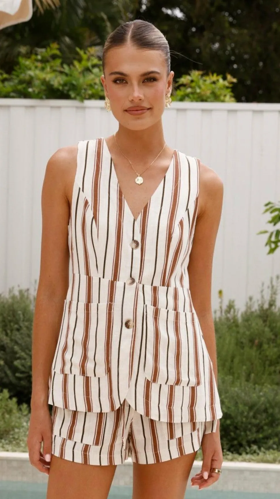 Get the look! Gretal Slide – Tan & Varian Button Vest – Tan Stripe