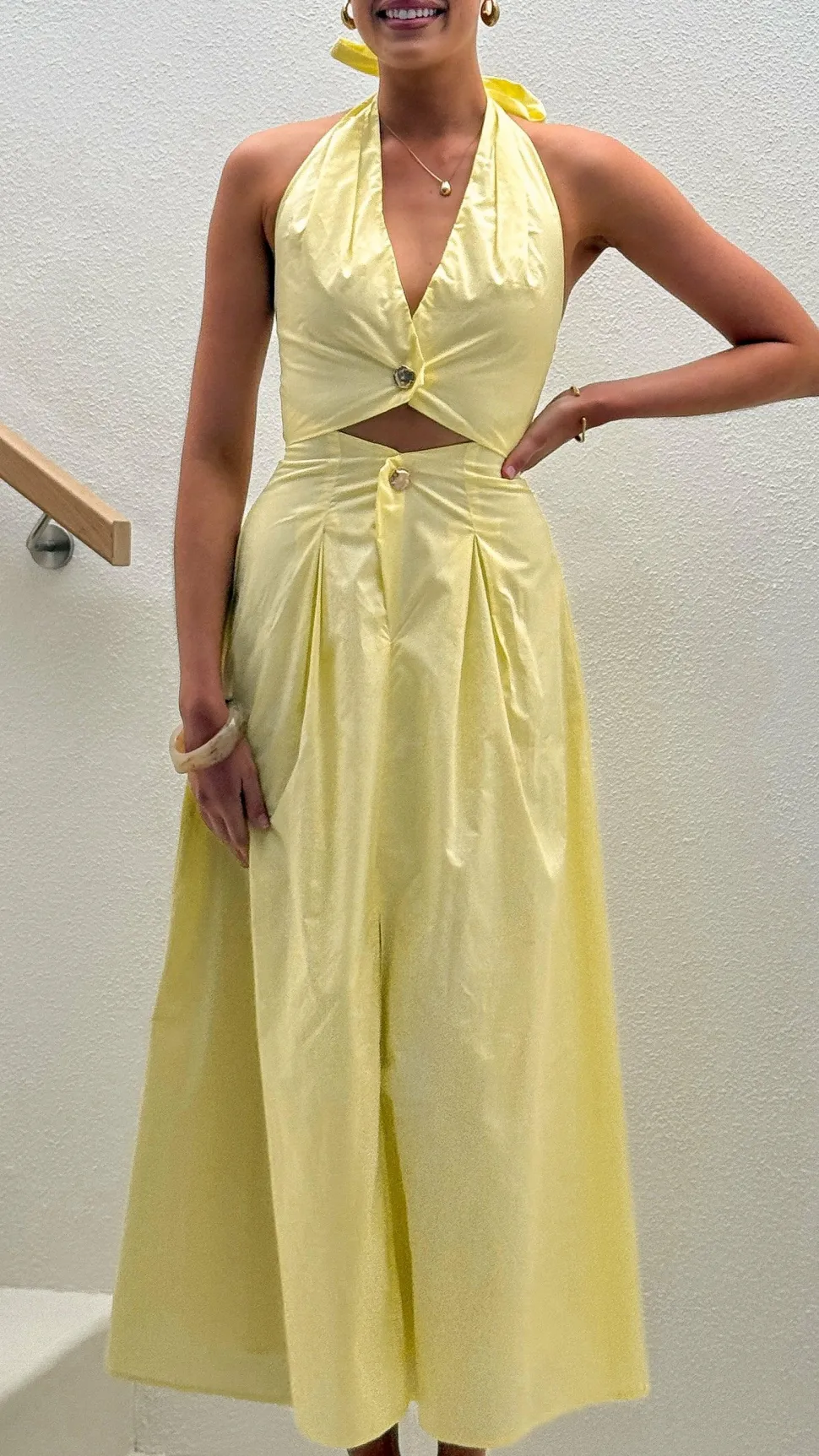 This elegant yellow maxi dress features a halterneck tie and pleated detailing along the neckline. It is adorned with decorative metal buttons at the front, equipped with a concealed back zipper, and includes hidden side pockets. Crafted from 100% cotton and fully lined for comfort and sophistication.