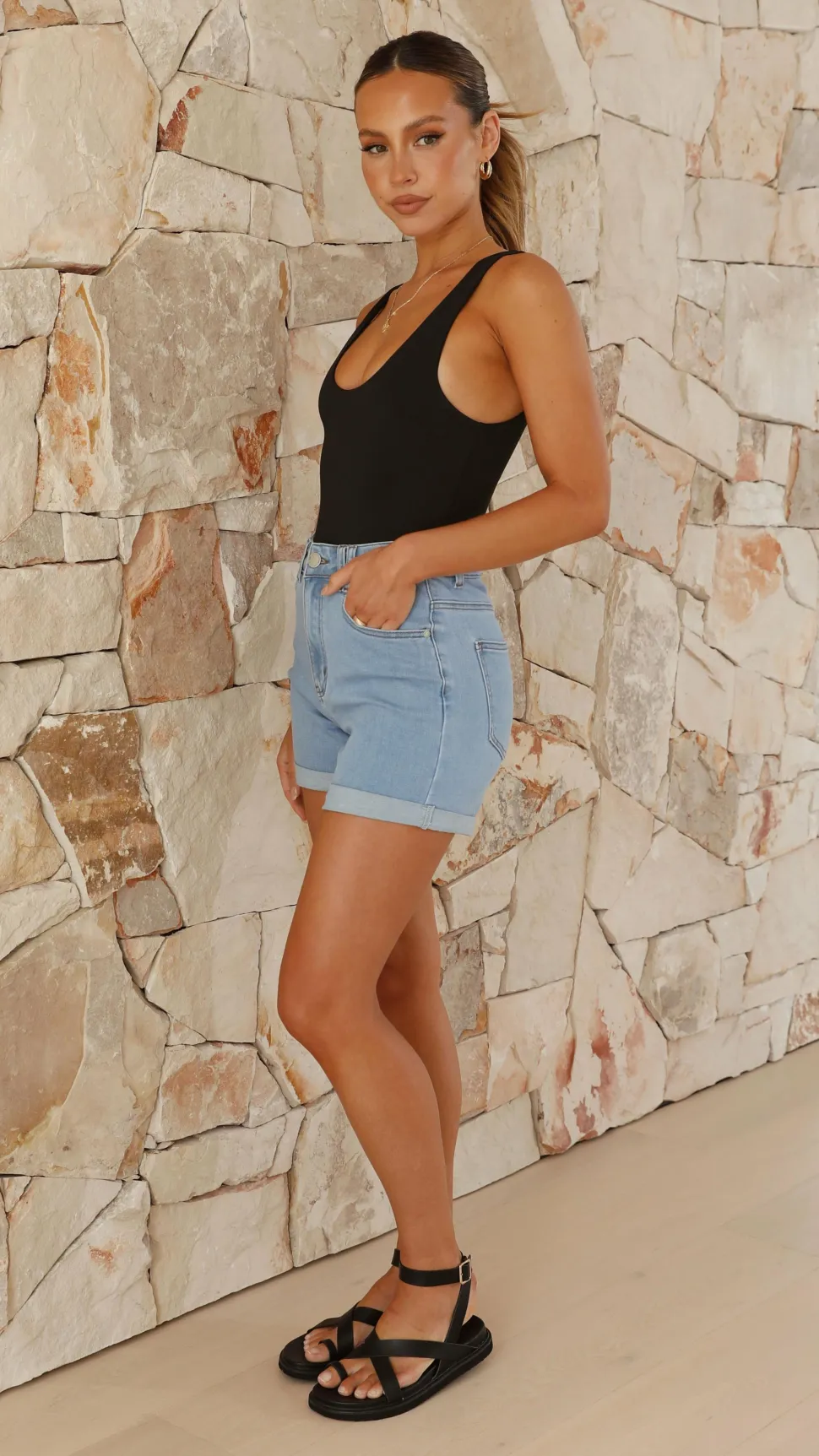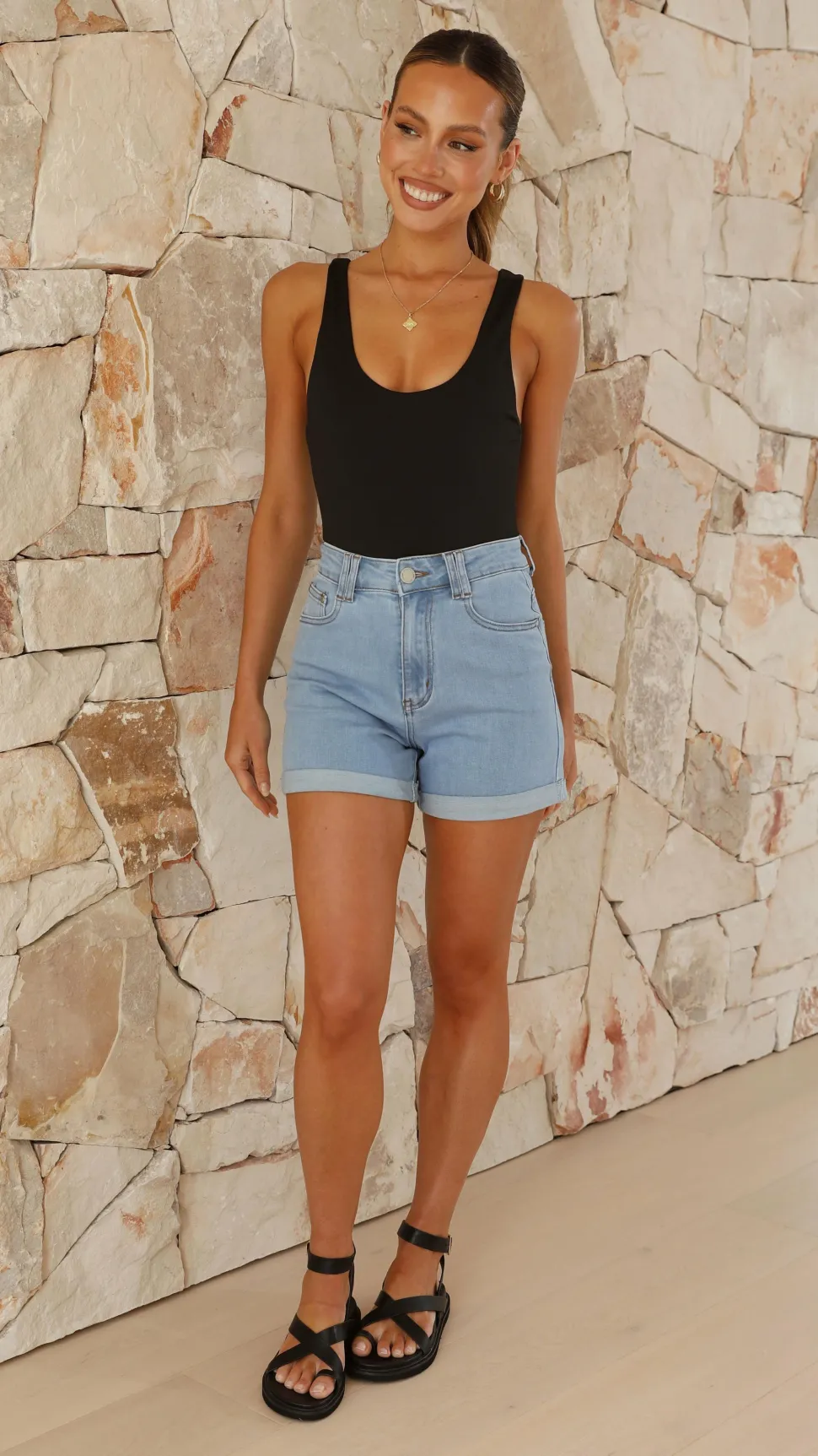 Get the look! Raffi Shorts – Light Denim &Zoelie Sandal – Black