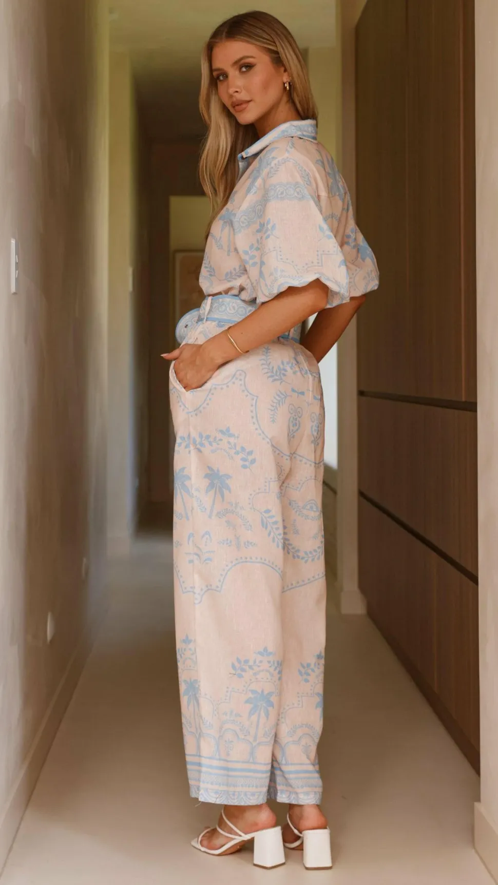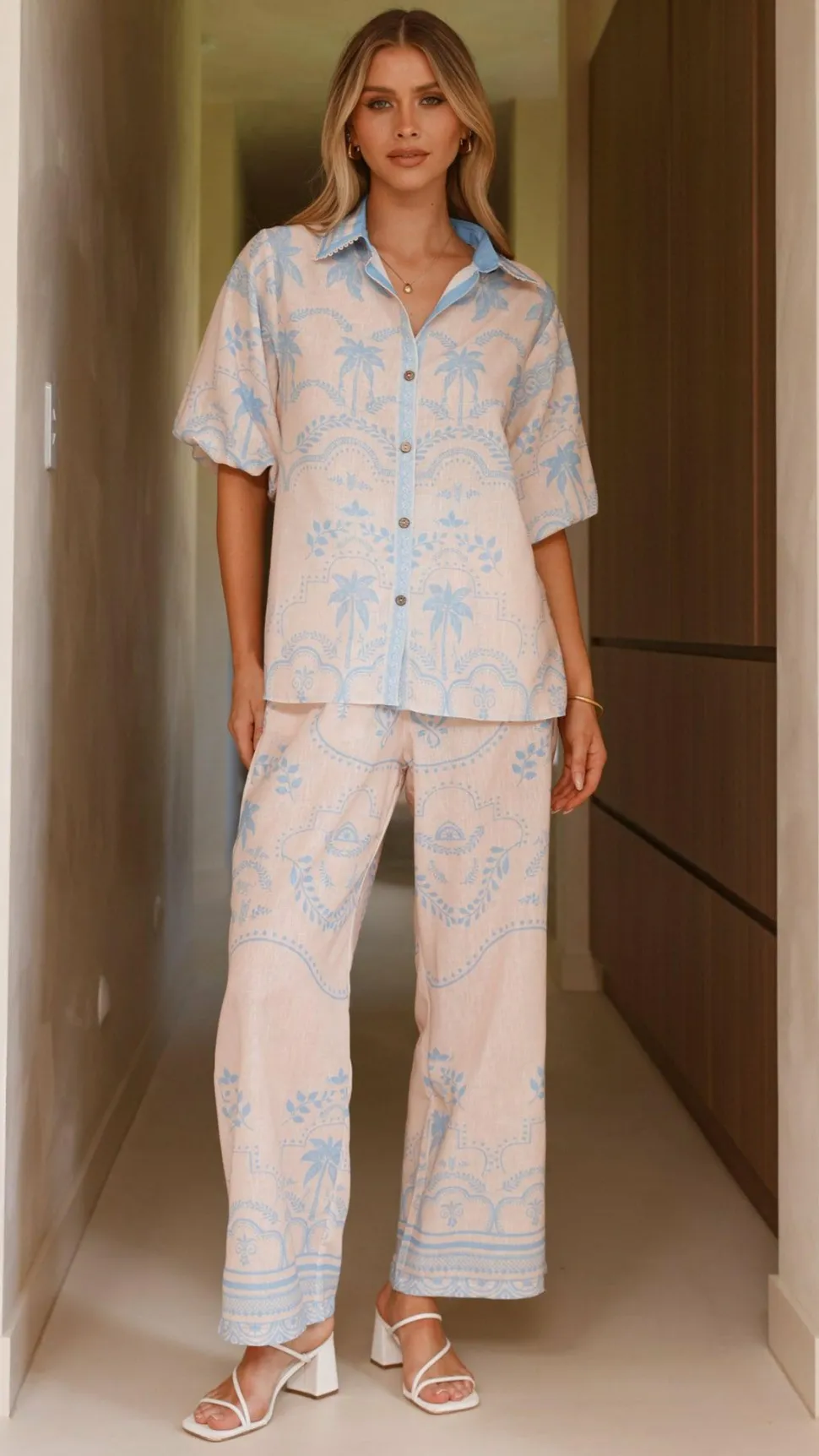 Get the look! Xander Wide Leg Pants – Blue & Yazmin Heel 2.0 – White