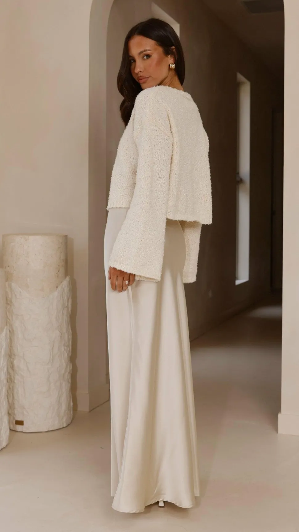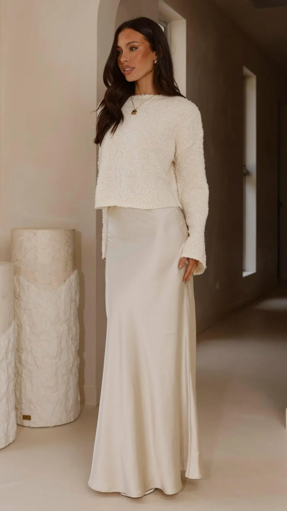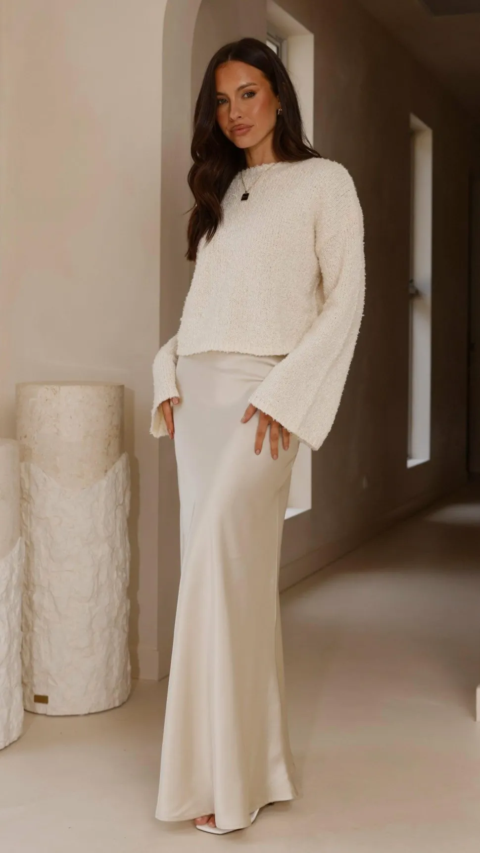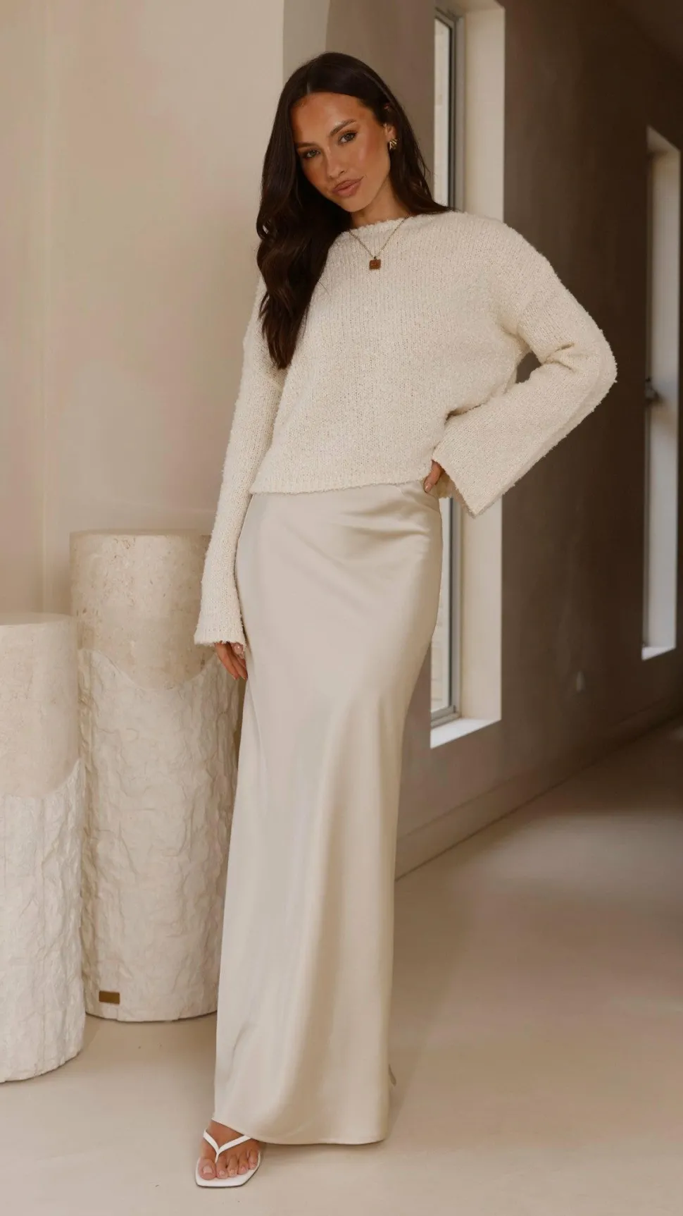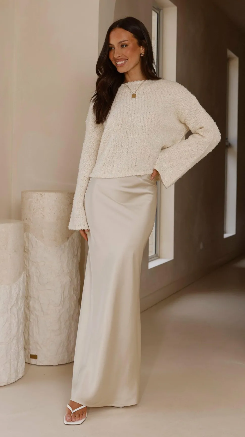 Get the look! Darina Bias Cut Maxi Skirt – Champagne & Xami Heel – White
