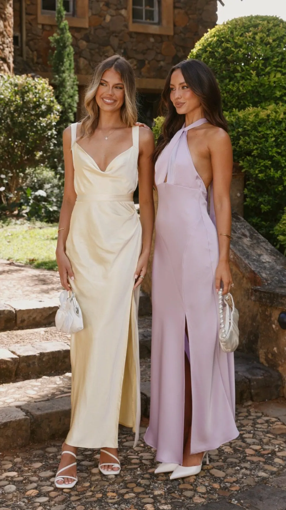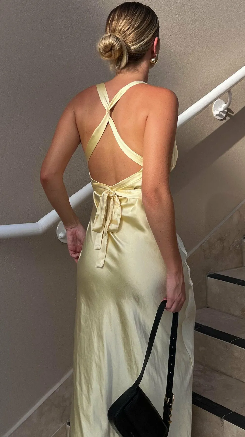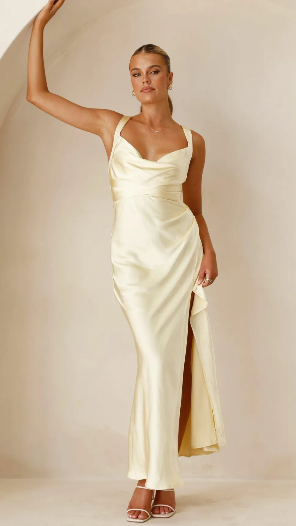 This elegant maxi dress features a cowl neckline and a side split for added movement. The versatile straps can be styled tied at the front or crossed at the back, complemented by an invisible side zipper for a seamless finish.